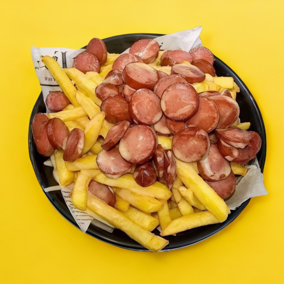 Orden de papas a la francesa con salchichas fritas, queso amarillo estilo nachos y longaniza.