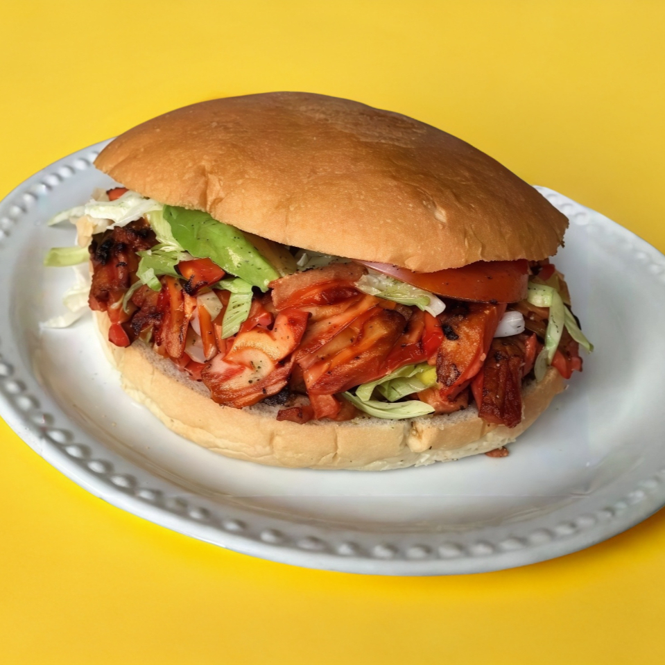 Telera jumbo con milanesa de pollo, salchicha, jamón, pierna española, queso, frijoles, cebolla, jitomate, aguacate y lechuga.