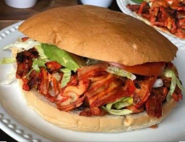 Telera jumbo con pastor, jamón, queso, frijoles, cebolla, jitomate, aguacate y lechuga.