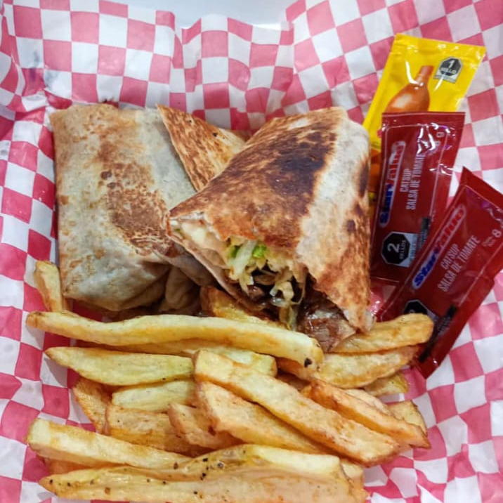 Burrito de carne enchilada con frijoles, queso, lechuga, aguacate y papas.