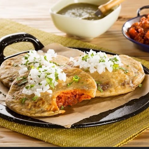 Pambazo relleno de carne enchilada, lechuga, crema, queso y carne enchilada.