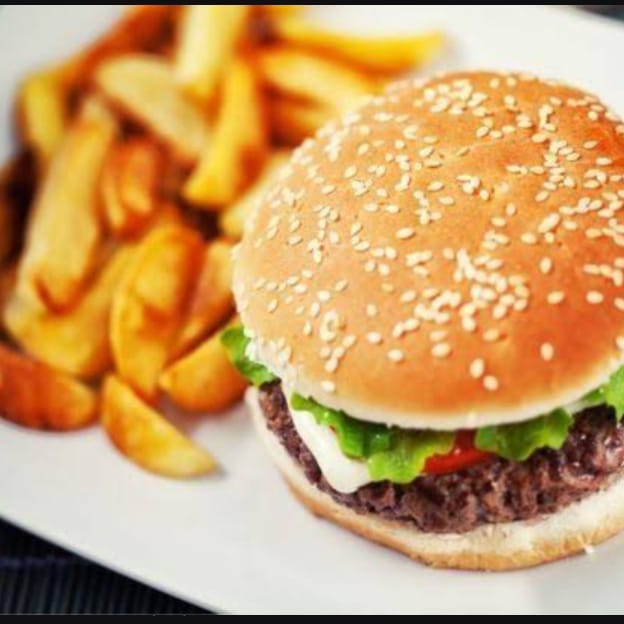 Carne artesanal 100 gr, kétchup, mostaza, mayonesa, jitomate, cebolla, lechuga y queso amarillo.