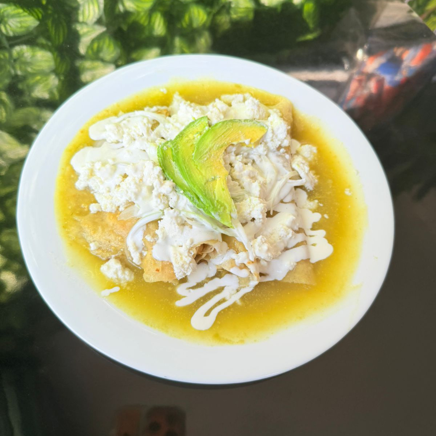 Tortilla frita bañada de salsaverde acompañado de pollo desmenuzado, crema, cebolla, queso y aguacate