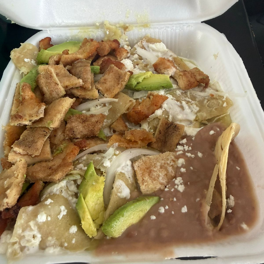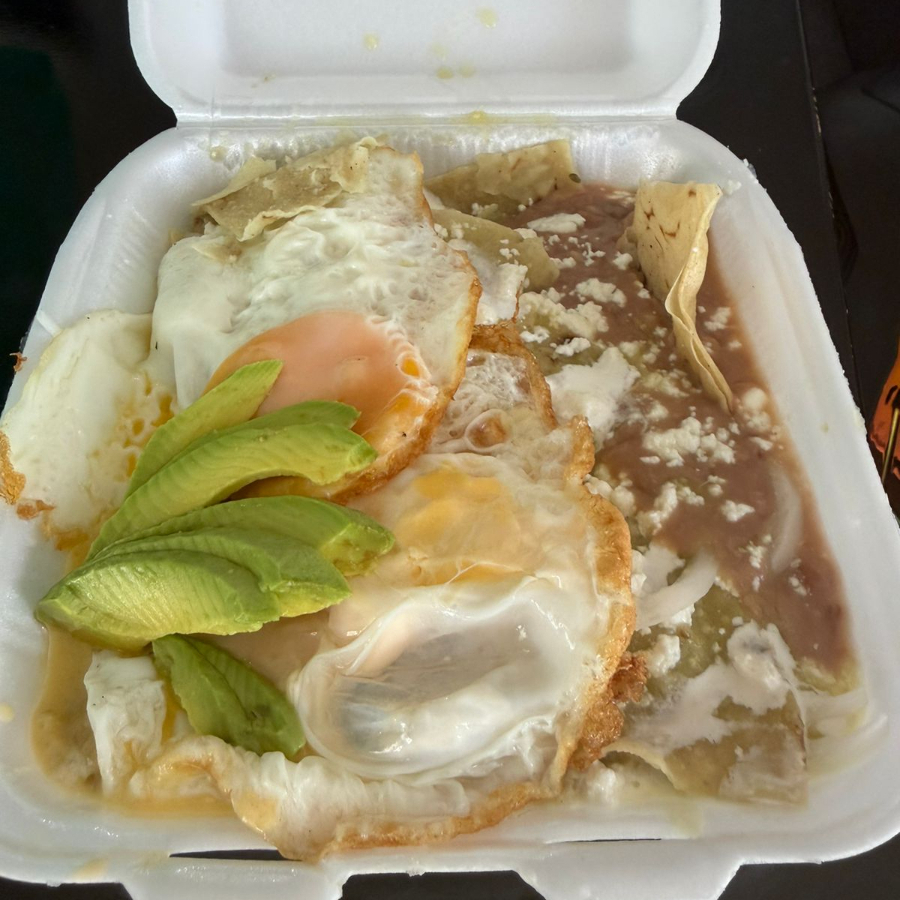 tortilla frita bañada de salsa verde, acompañado de 2 huevos estrellados, crema, queso, cebilla y aguacate