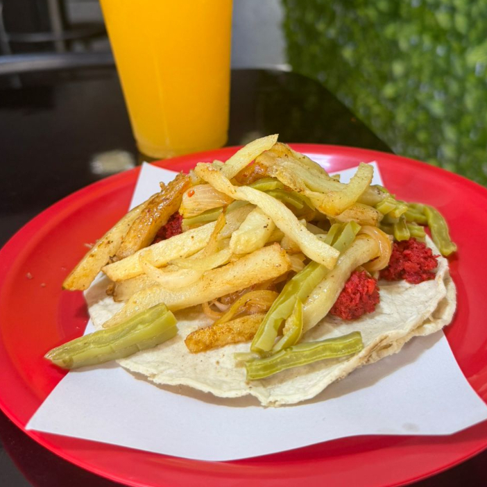 4 pz de tortilla rellenas de pollo, lleva crema, queso, cebolla y 1 pz de milaneza empanizada de pollo