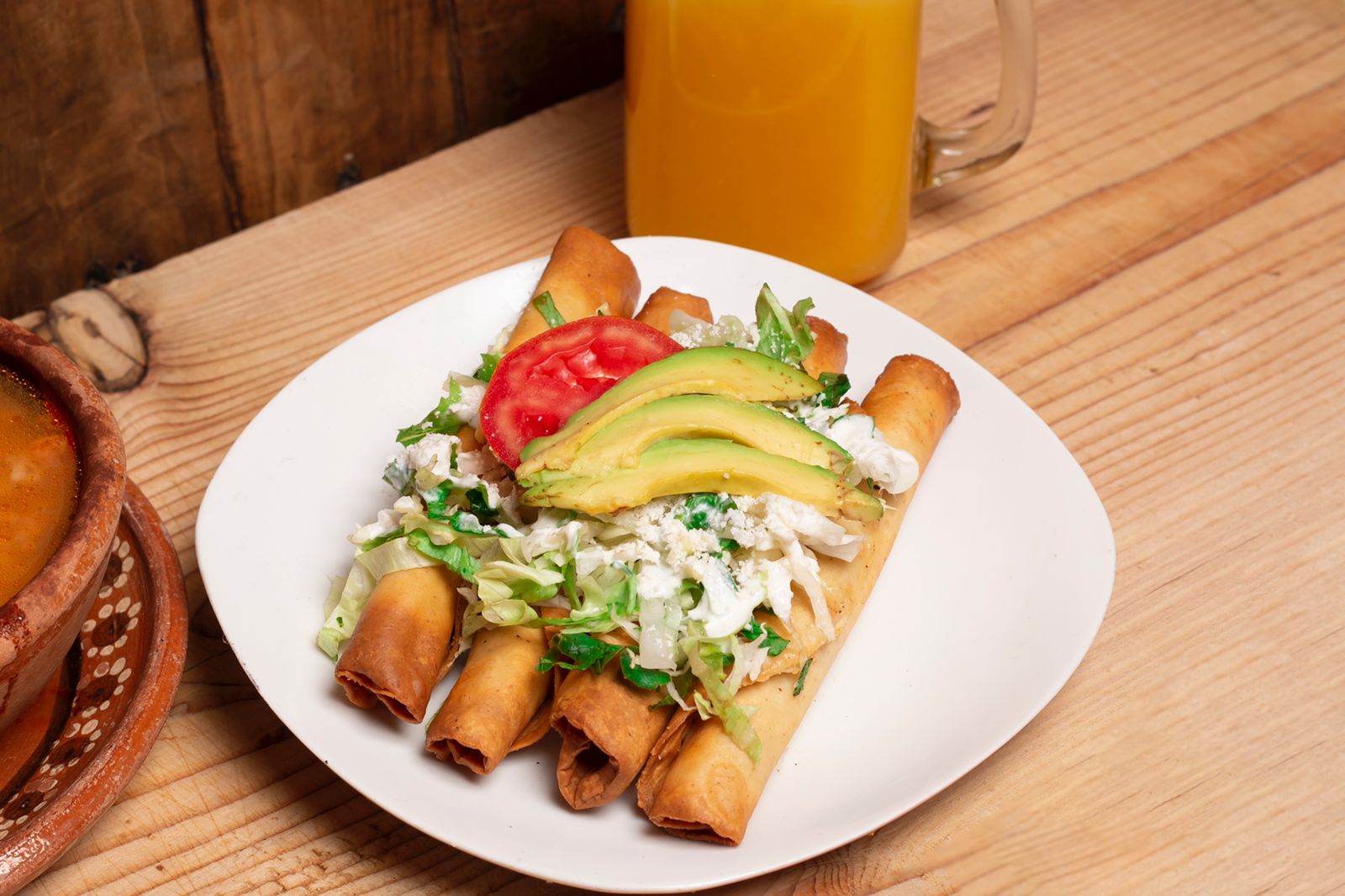 4 piezas, Acompañados con frijoles, lechuga, crema, queso en polvo, jitomate y aguacate