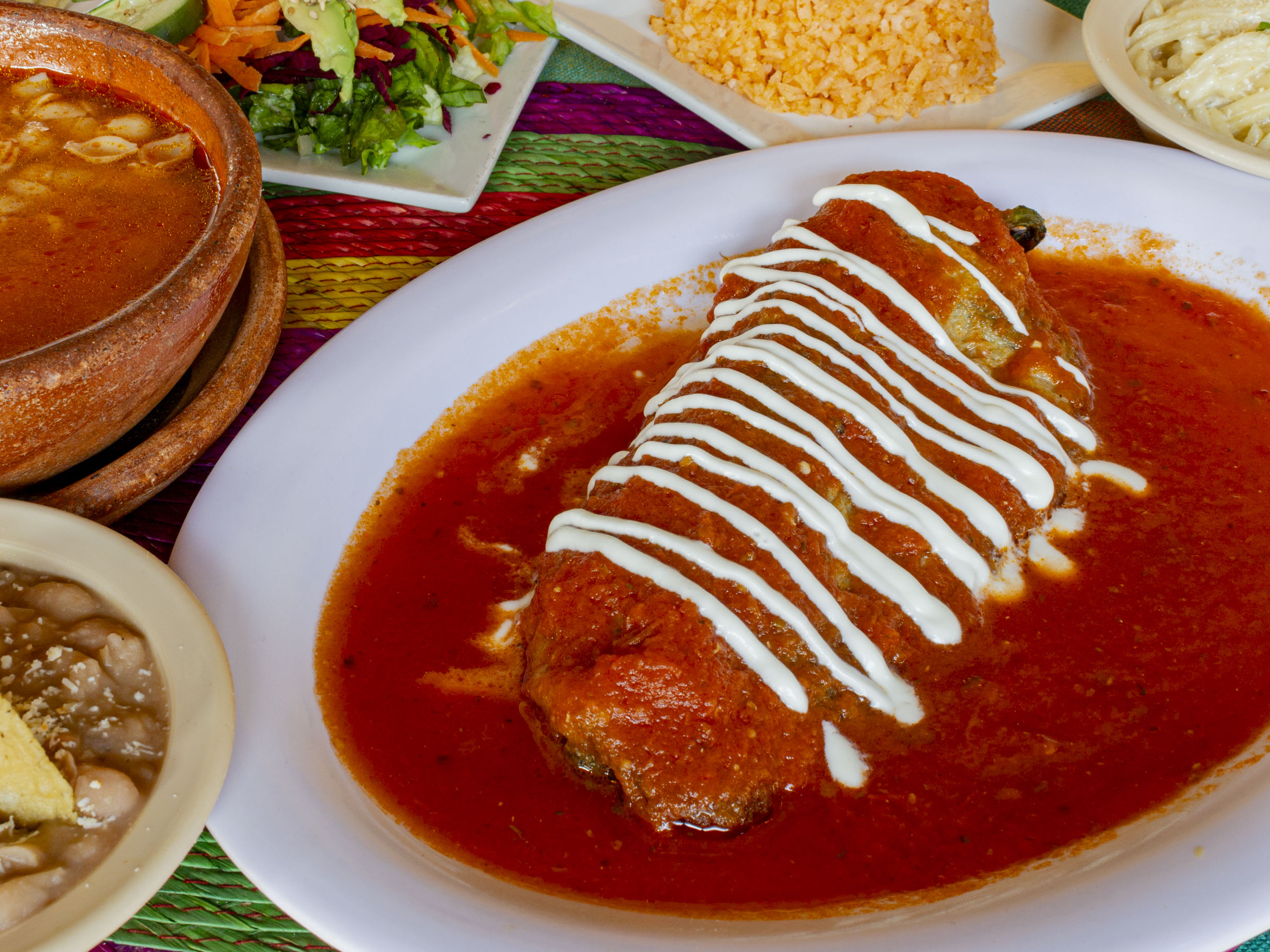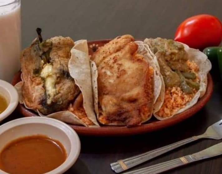 Relleno con queso manchego, acompañado con tortillas hechas a mano, arroz y frijoles
