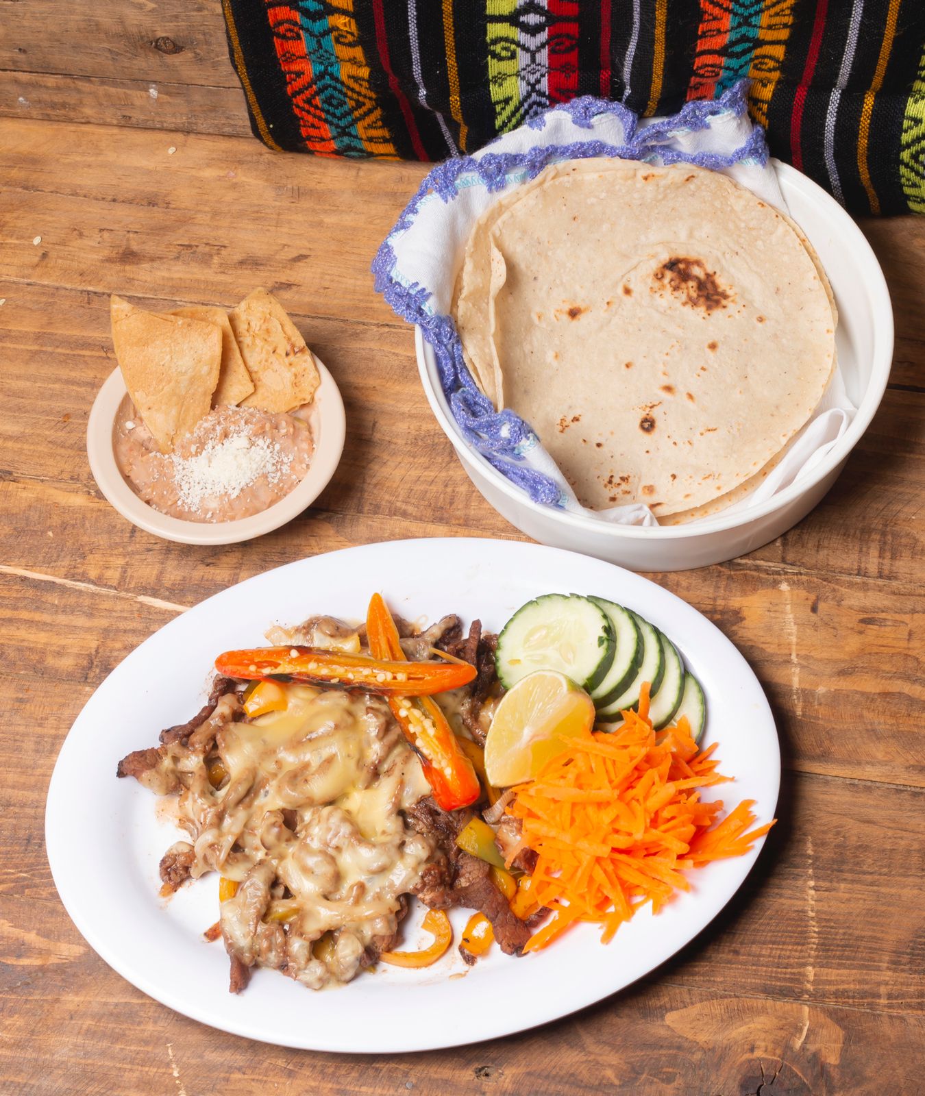 Fajitas de pollo, morron, cebolla y queso (hechos con tortilla especial de harina, rellenos de frijoles, arroz, lechuga, aguacate, jitomate y cebolla y queso gratinado)