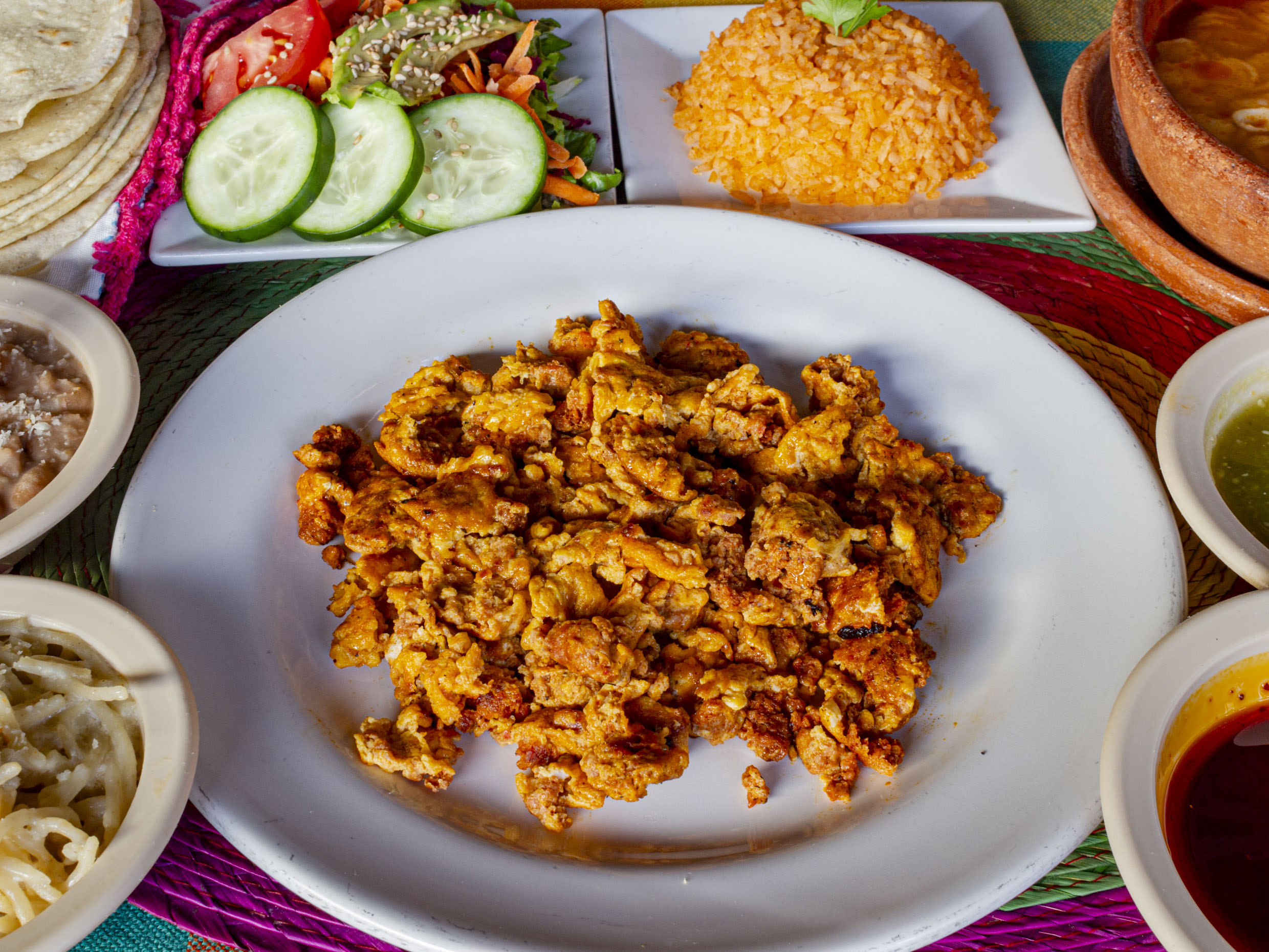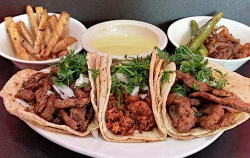 Acompañado con 3 tortillas hechas a mano, arroz, nopales, rajas y salsa casera.