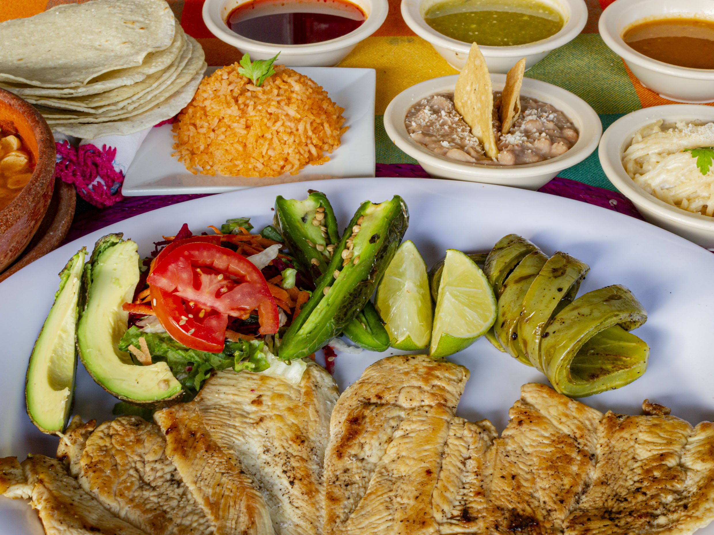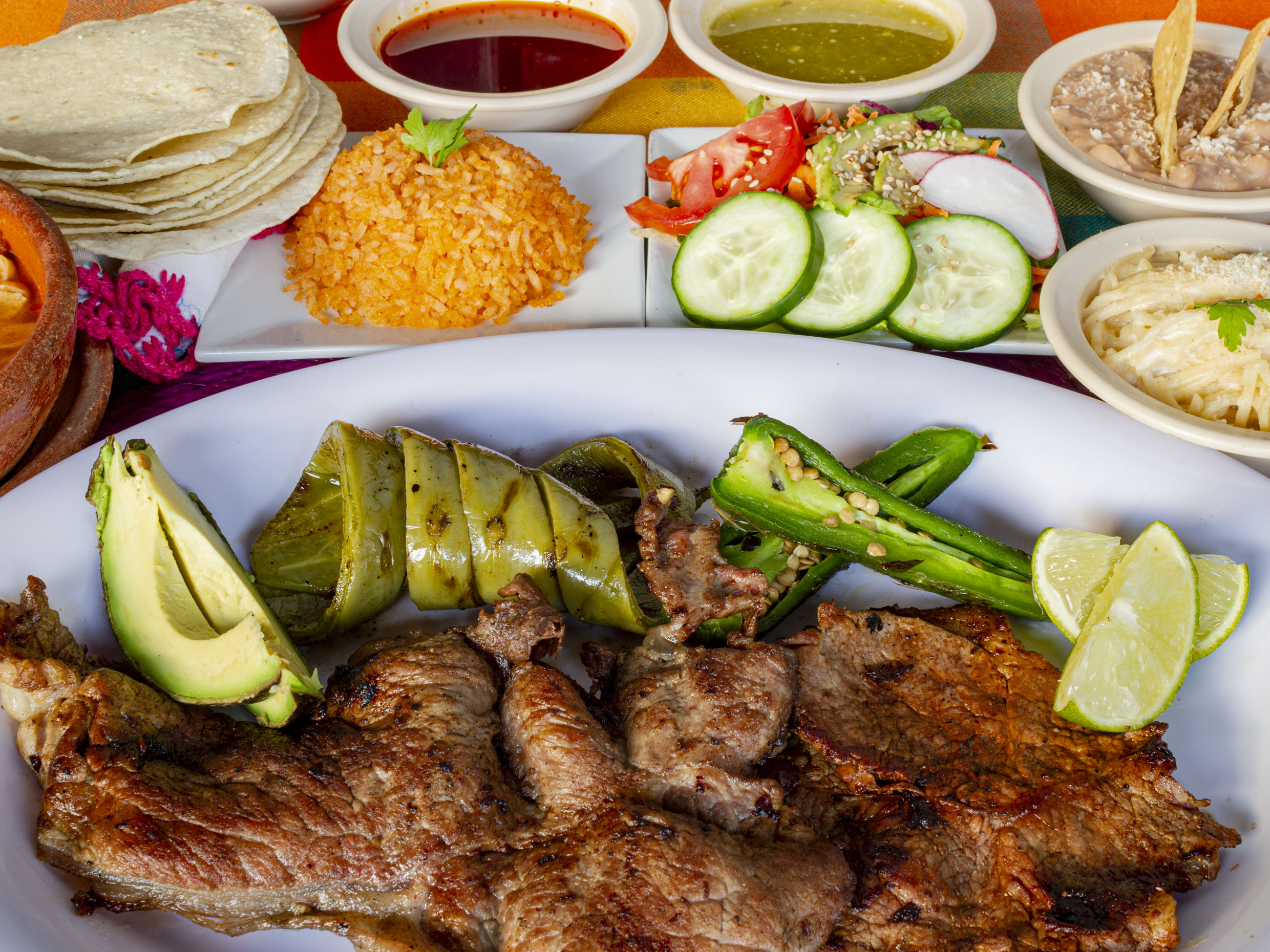 Acompañado con 4 tortillas hechas a mano, 2 guarniciones (arroz, frijoles, espagueti o ensalada), 1/2 lt de agua fresca
