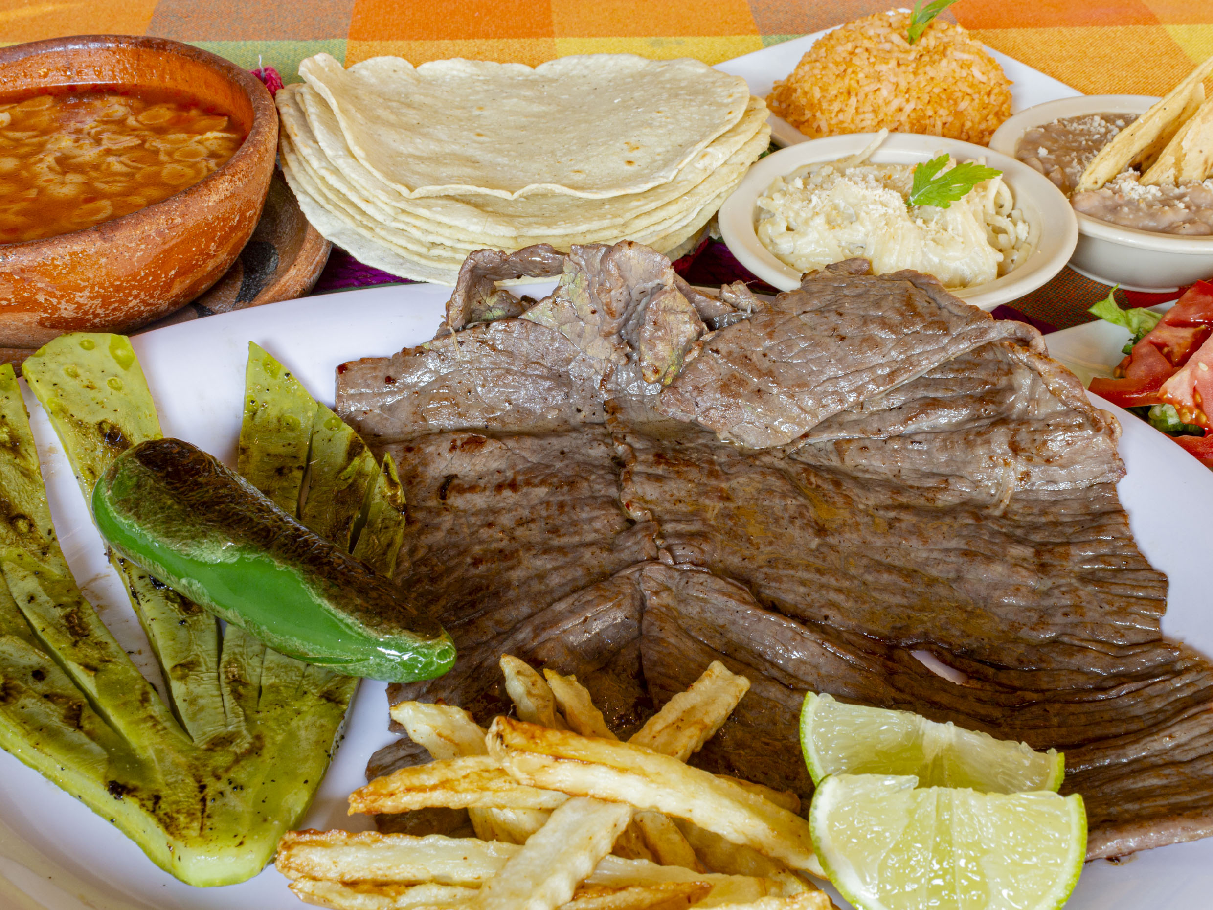 Acompañado con papas fritas, sopa del día, tortillas hechas a mano y 2 guarniciones a elegir (arroz, frijoles, espagueti o ensalada)