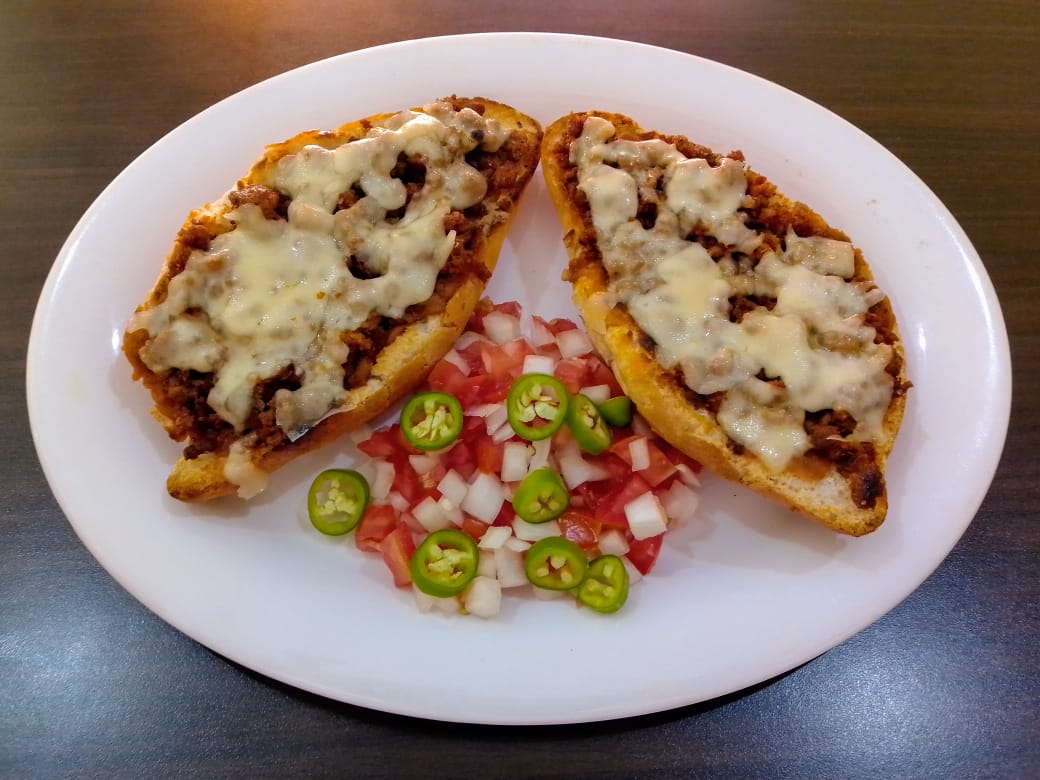 Pan de base bolillo con frijoles refritos, queso manchego y pico de gallo