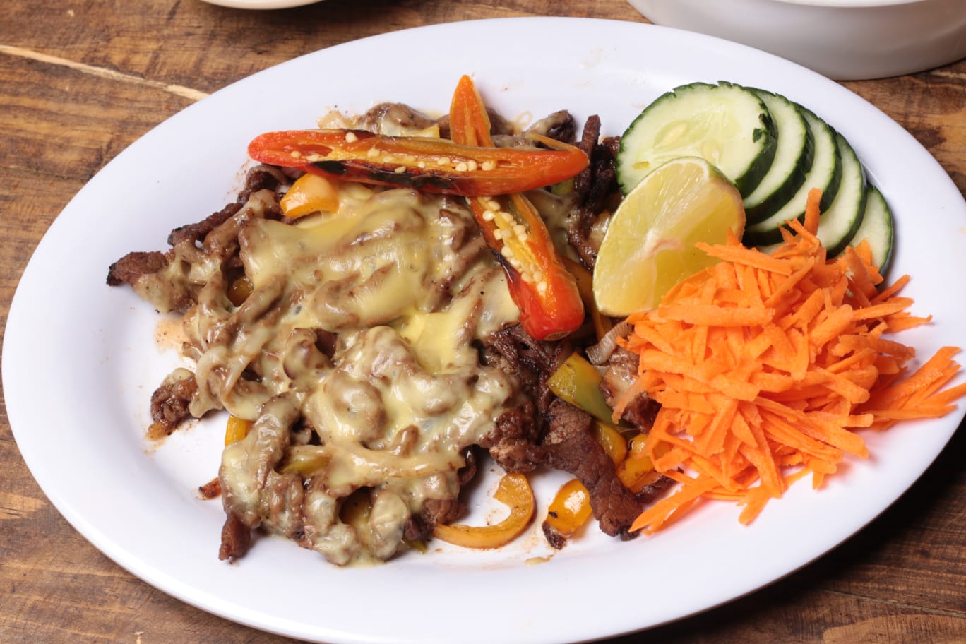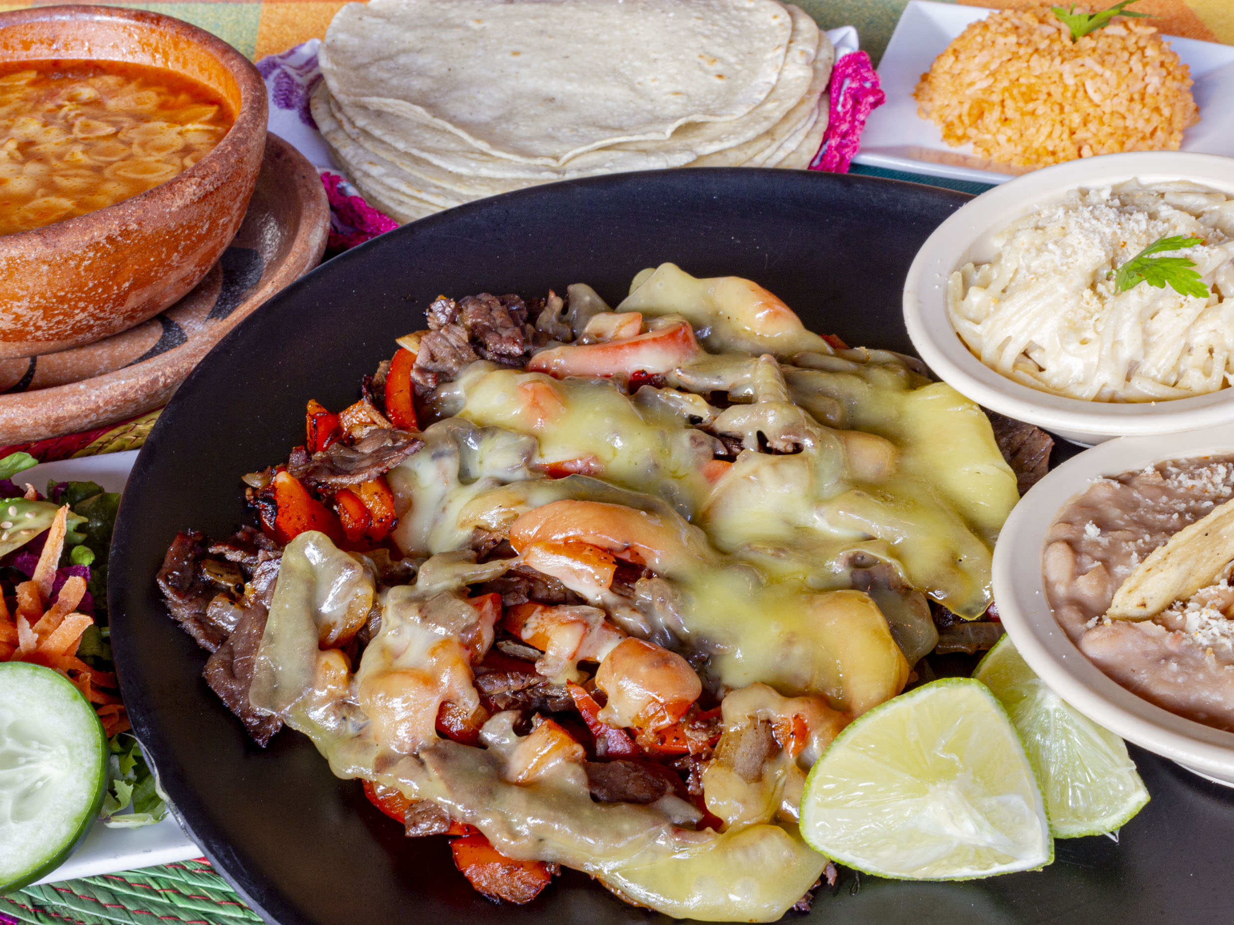 Bistec de res, morron,cebolla y queso (hechos con tortilla especial de harina, rellenos de frijoles, arroz, lechuga, aguacate, jitomate y cebolla y queso gratinado)