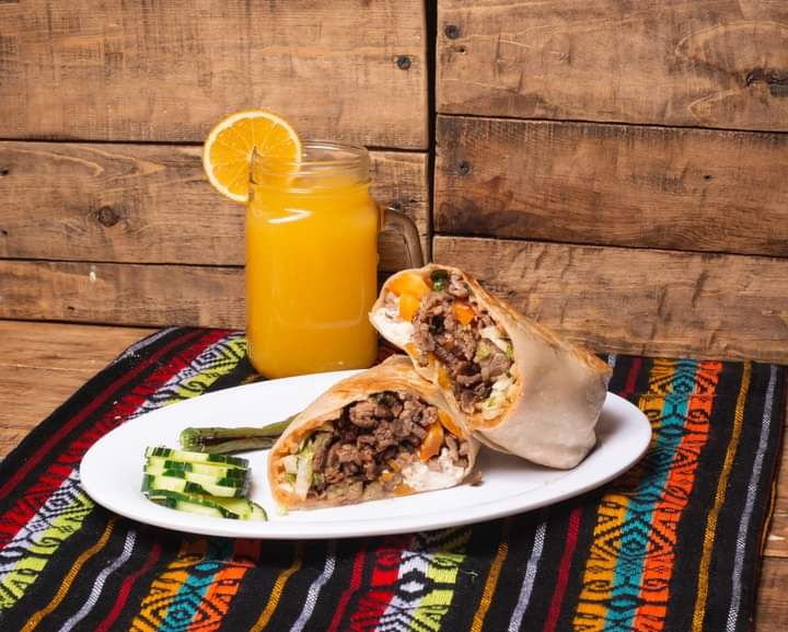 Bistec, longaniza, milanesa, morron y queso (hechos con tortilla especial de harina, rellenos de frijoles, arroz, lechuga, aguacate, jitomate y cebolla y queso gratinado)