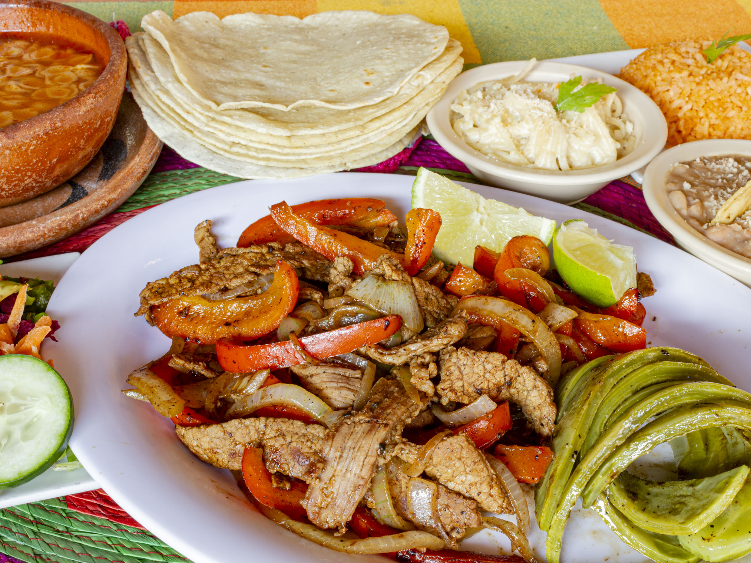 Fajitas de pollo con morrón, cebolla, queso manchego, sopa de entrada, tortillas hechas a mano y sopa de entrada.