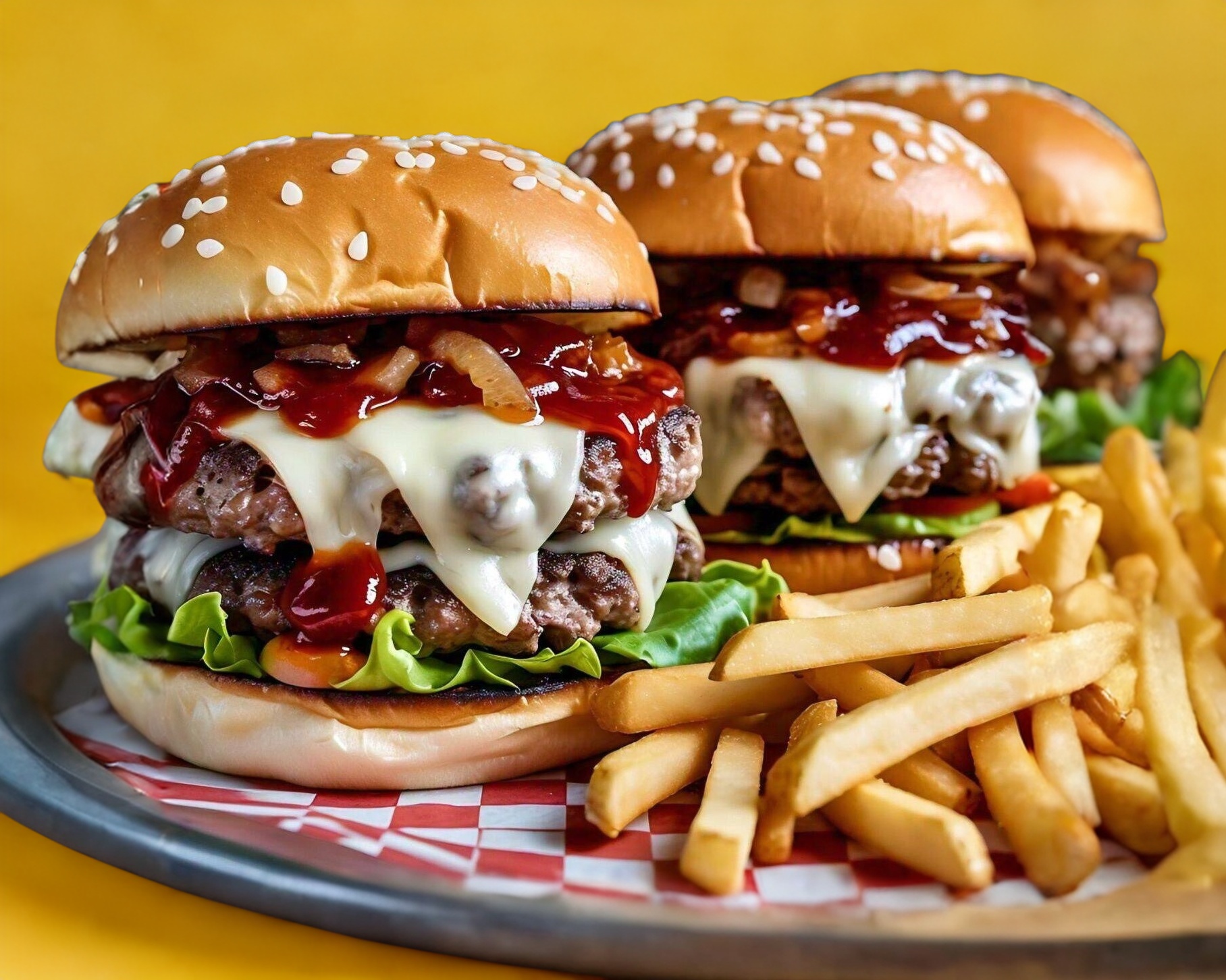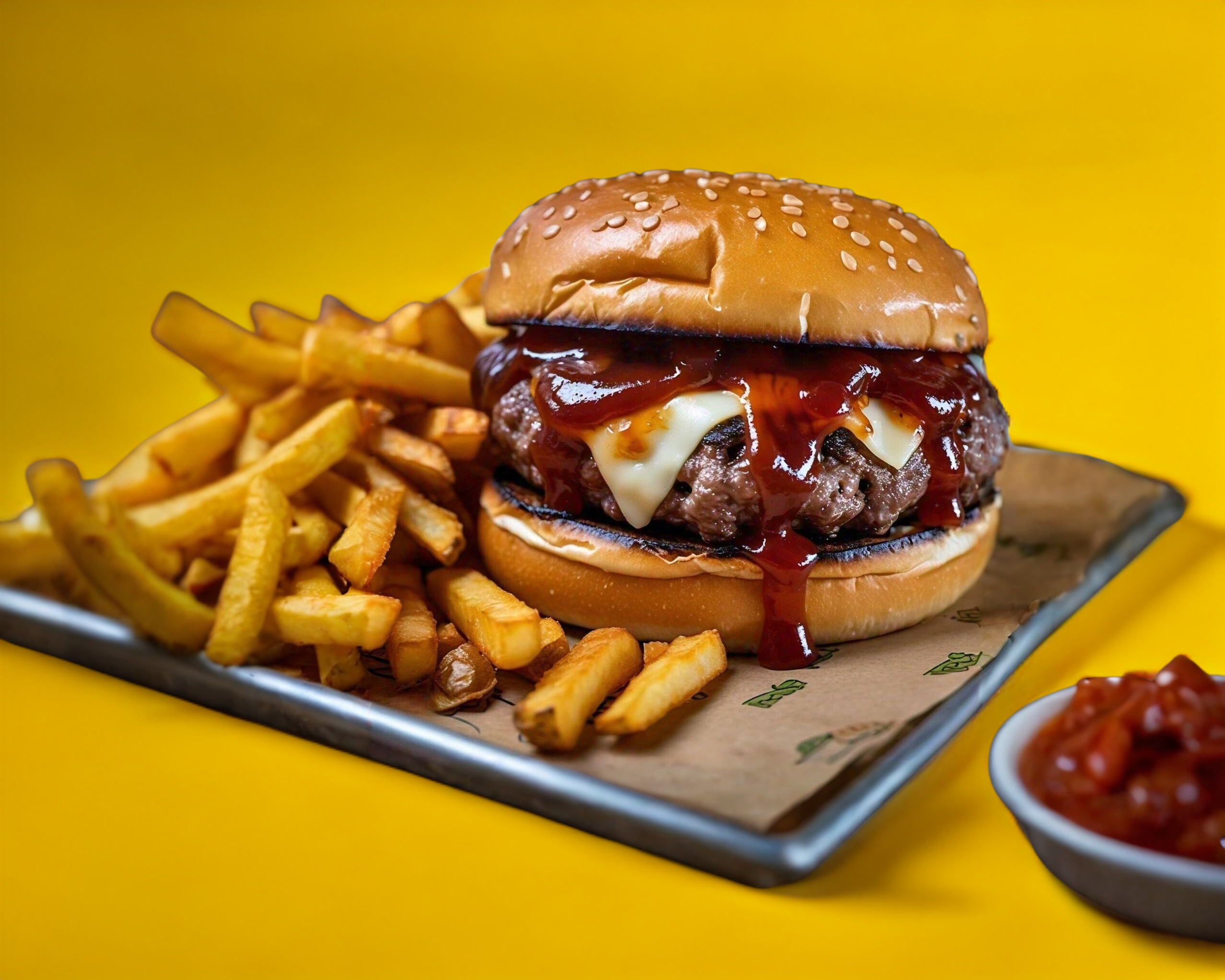 Hamburguesa de 180 g de arrachera molida con queso manchego dentro de la carne, cebolla asada, salsa BBQ y mayonesa. Acompañada de 150 g de papas a la francesa naturales, peso frito.