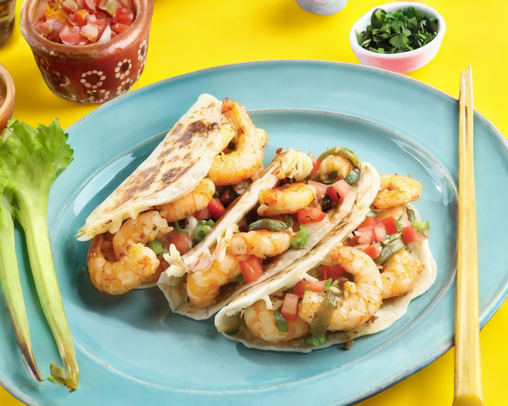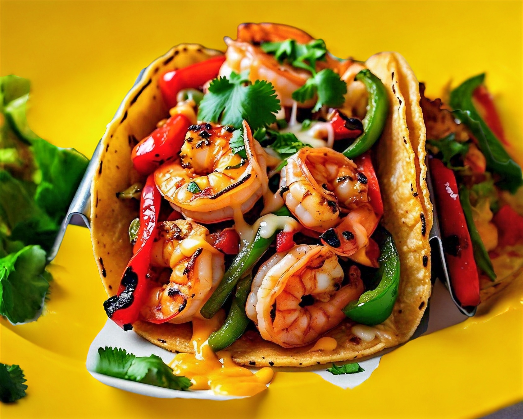 Delicioso TACO de CAMARÓN (65gr) guisado con morrón, poblano, cebolla, costra de queso y tortilla de harina