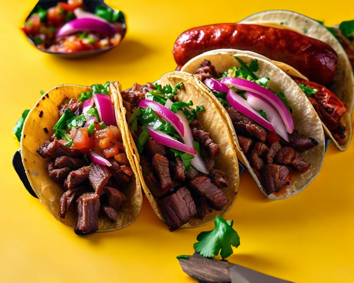 3 Tacos de Arrachera (c/Papas) + 1 Taco de Salchicha asadera (c/Papas)