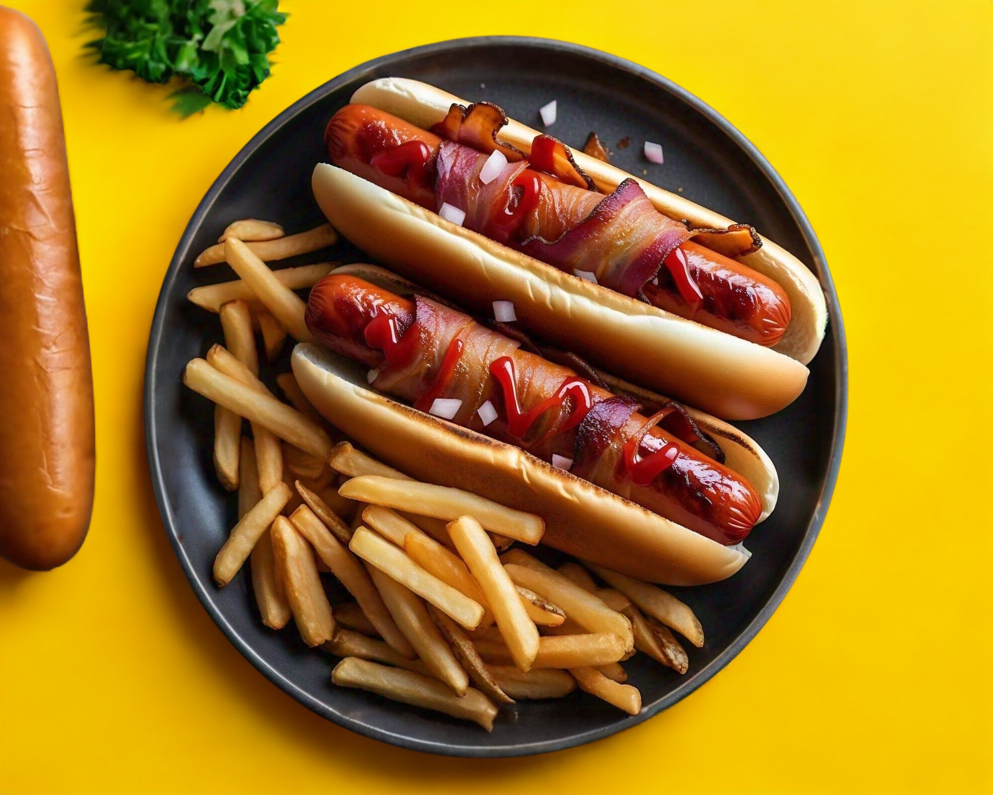 2 hotdogs envueltos en tocino, cebolla asada, bbq y mayonesa, ambos acompañados con papas francesas. (Mejor que los de carrito)