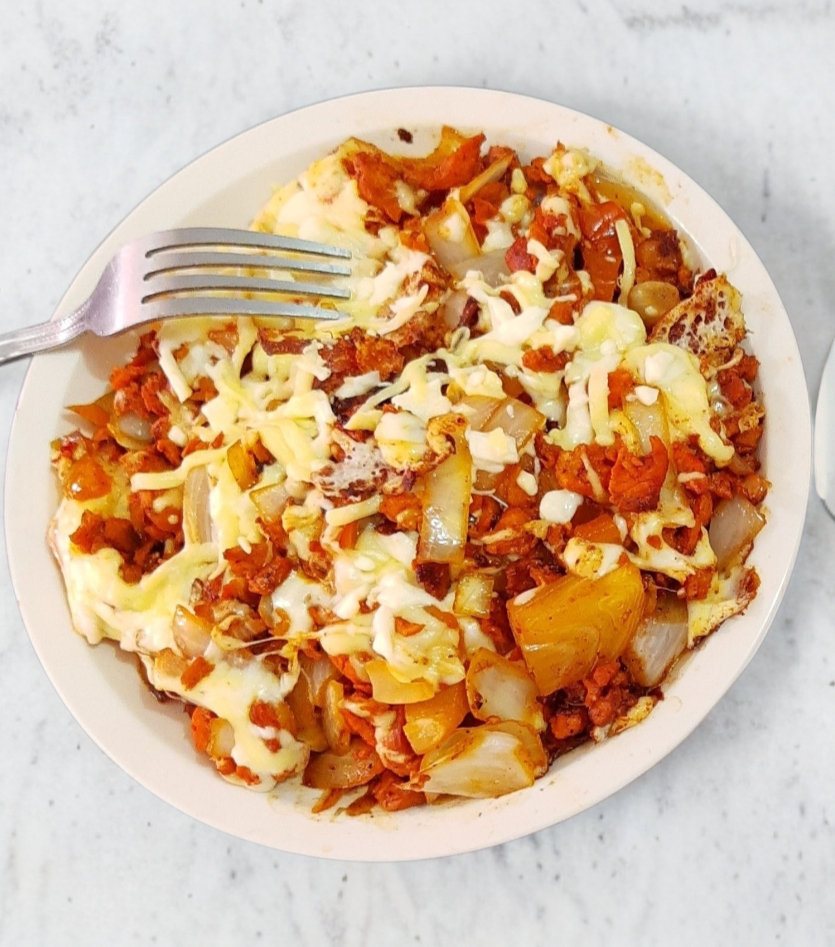 Chuleta, tocino, cebolla, morrón y queso.Con 10 tortillas de maiz