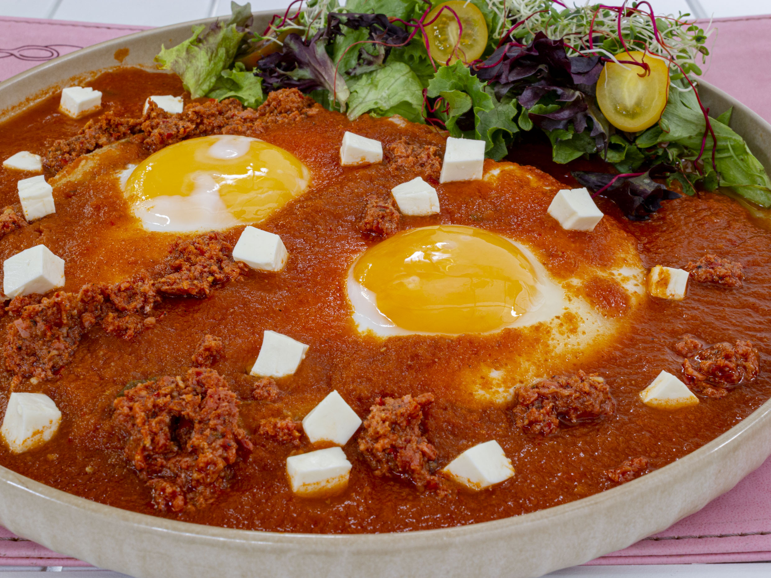 Huevos estrellados sobre una sincronizada de frijol, queso y jamón en salsa roja con chorizo. Incluye un cafecito de olla!