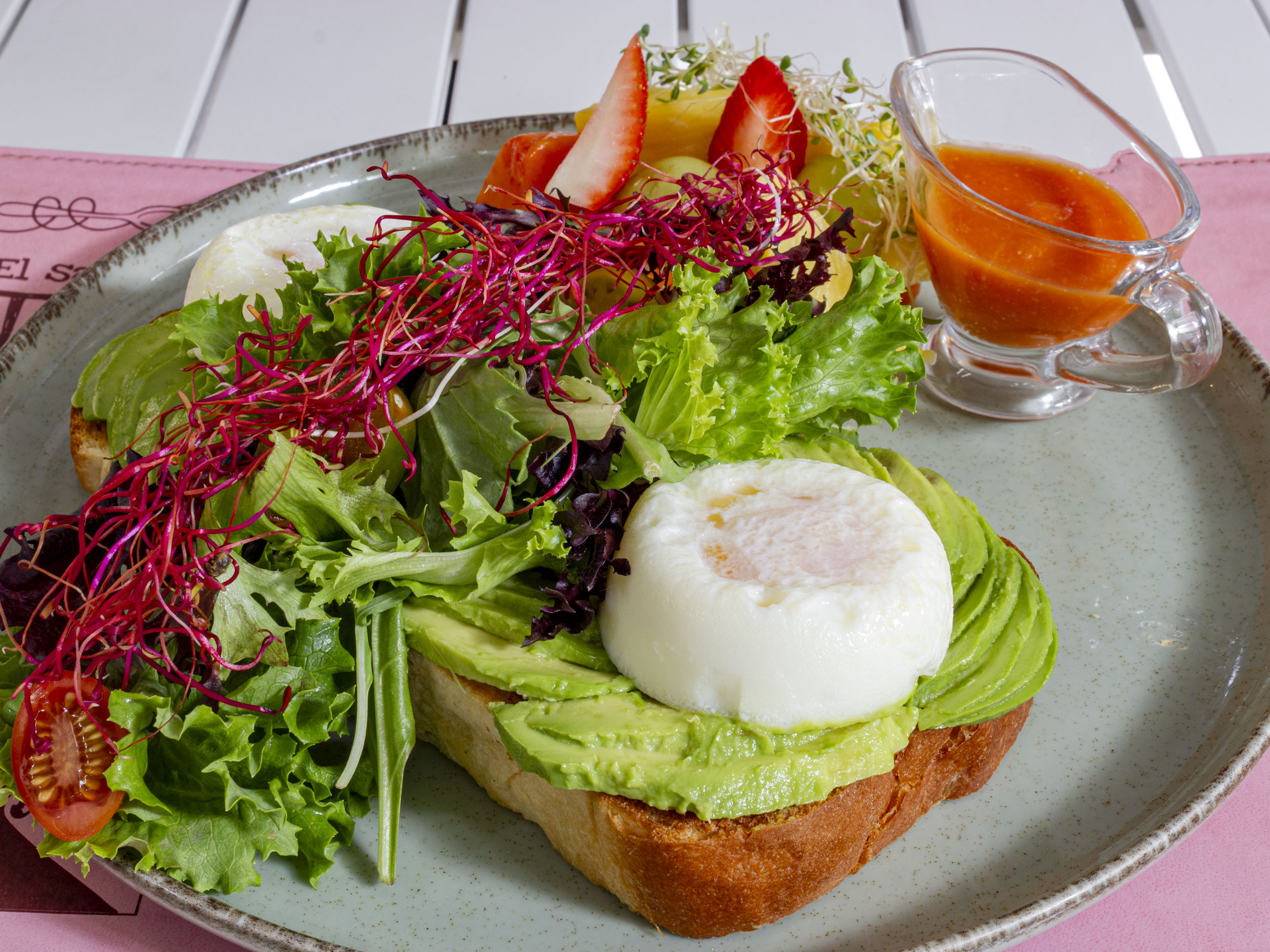 Pan tostado con crema de aguacate y dos huevitos estrellados, llevan ensalada con espinacas