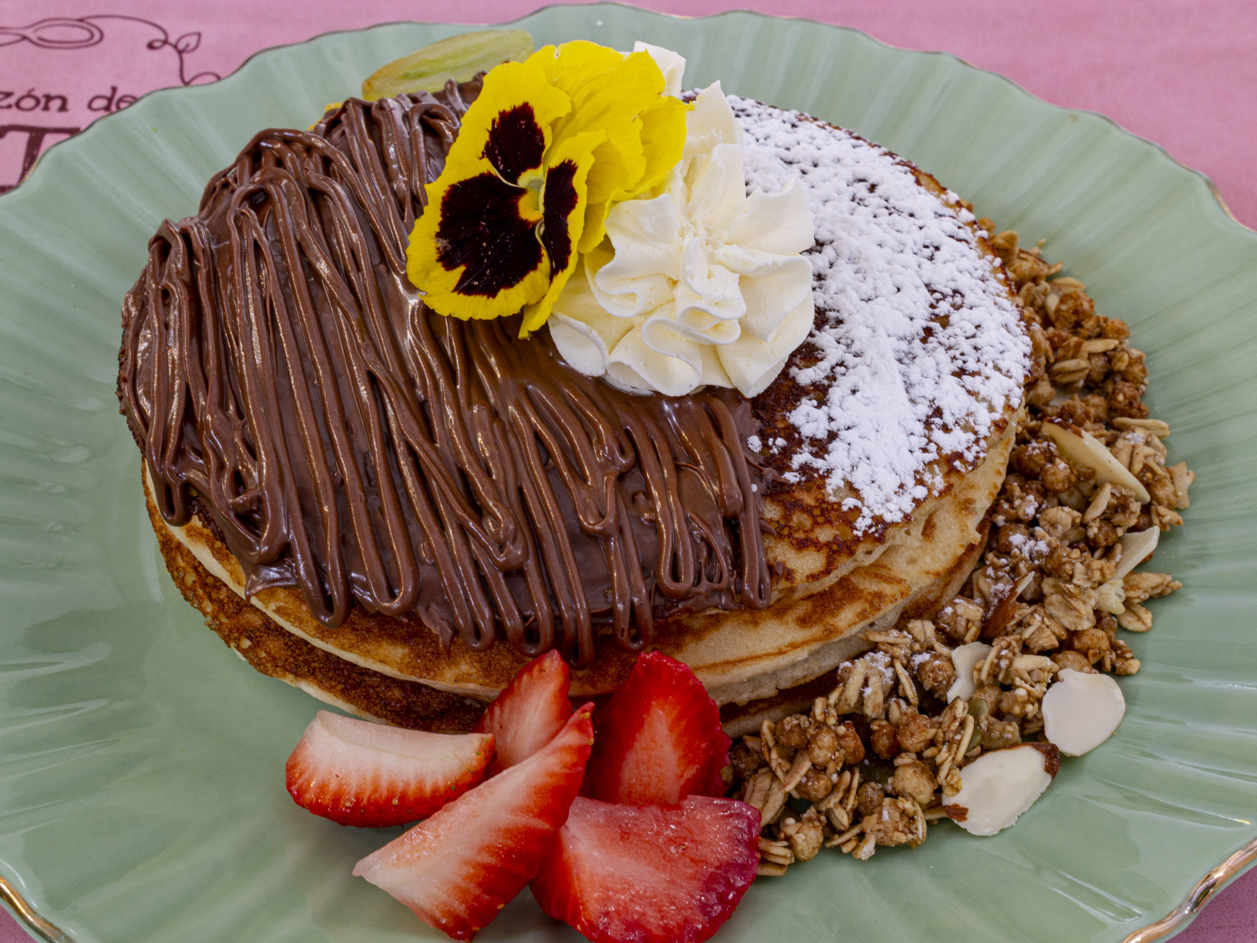 Exquisitos hotcakes acompañados de fruta, galleta chantilly. Elige tu topping: Chocolate, maple, mermelada o nutella! Incluye cafecito de olla