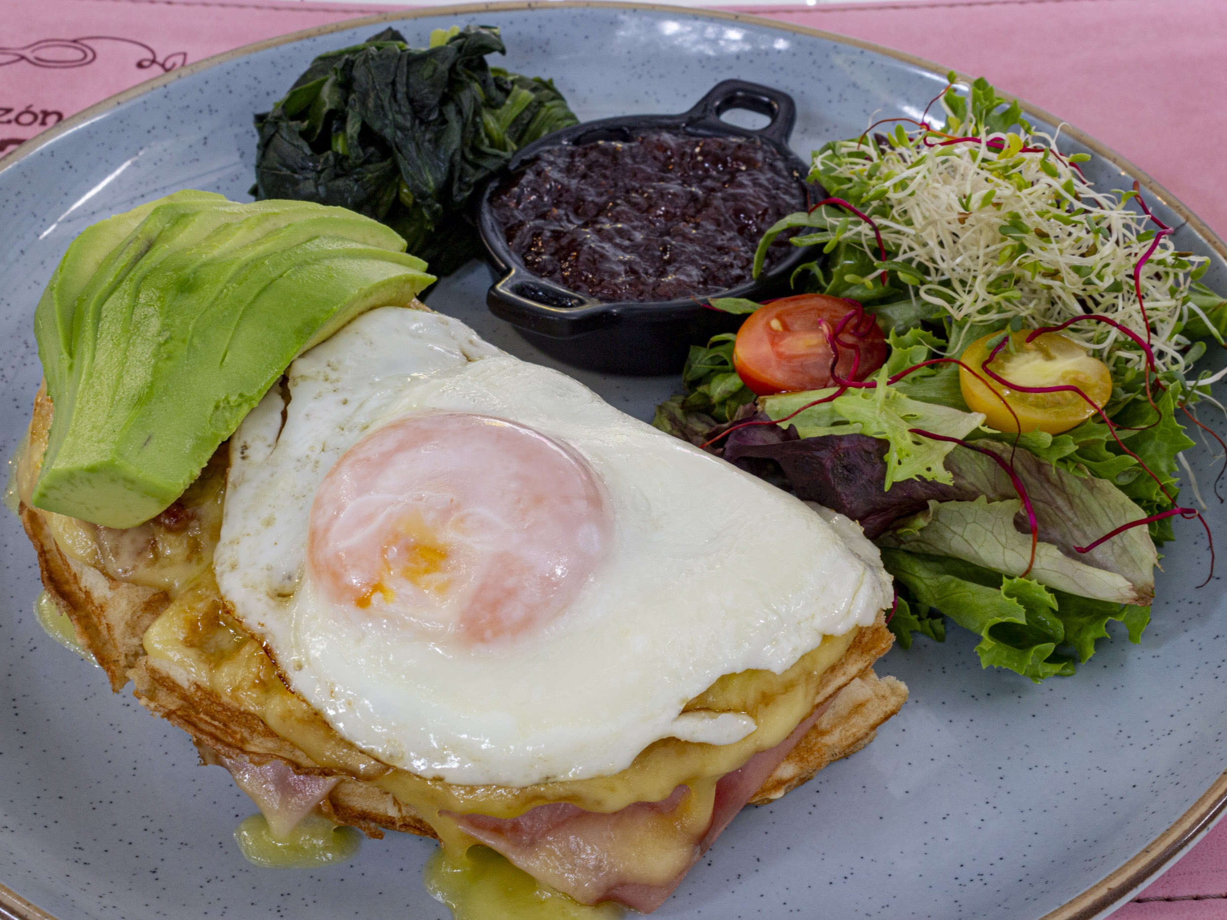 Relleno de omelette queso manchego, espinacas, acompañado de aguacatito, tocino, mermelada casera. Incluye un cafecito de olla!