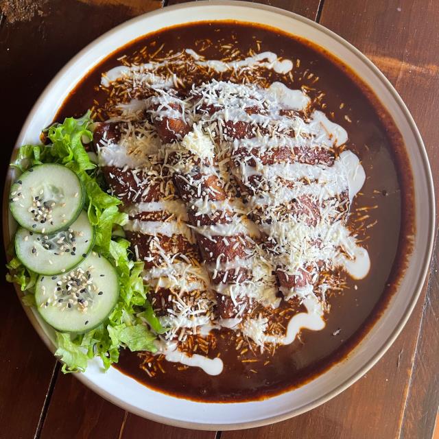 Prueba nuestras enchiladas rellenas de cecina, gratinadas y con aguacatito, acompañadas de un cafecito de olla!