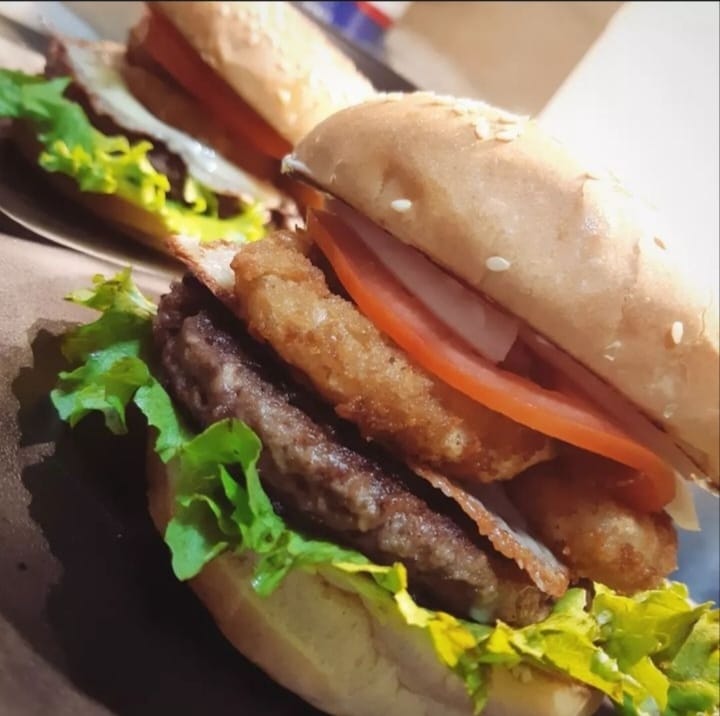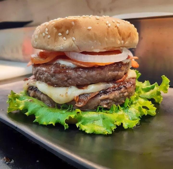 Doble came deres sirioin, doble queso manchego, tocino, jamón, lechuga,jitomate y cebolla.