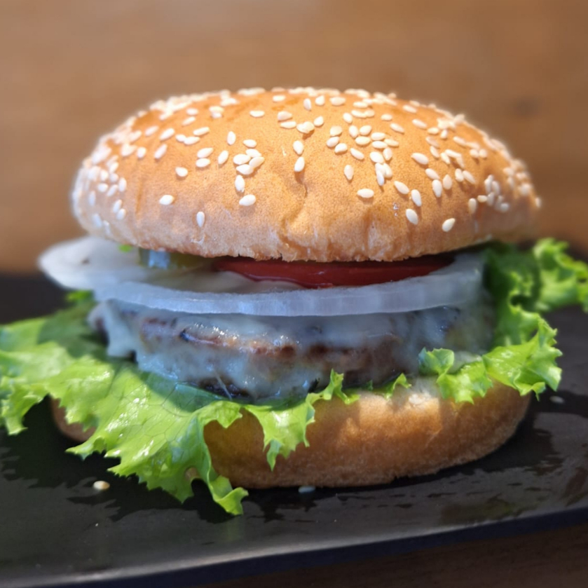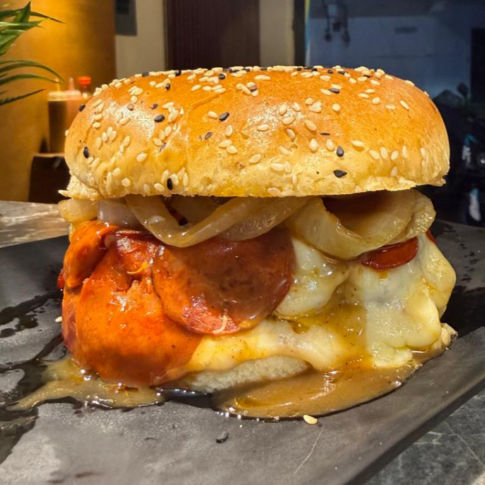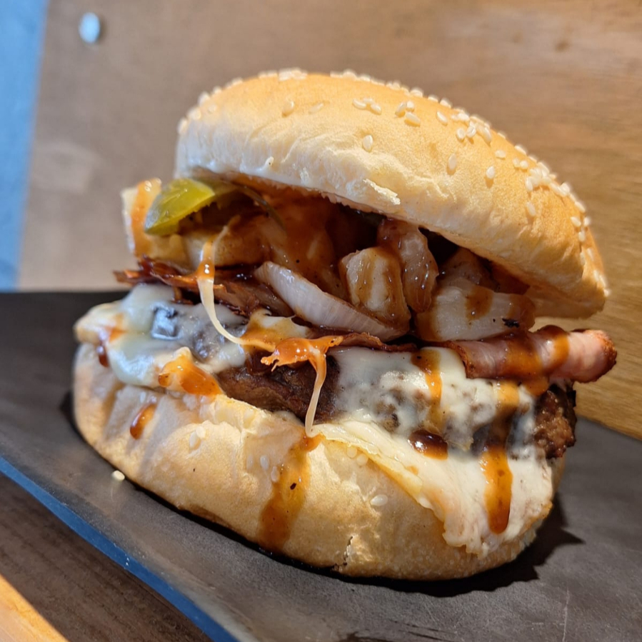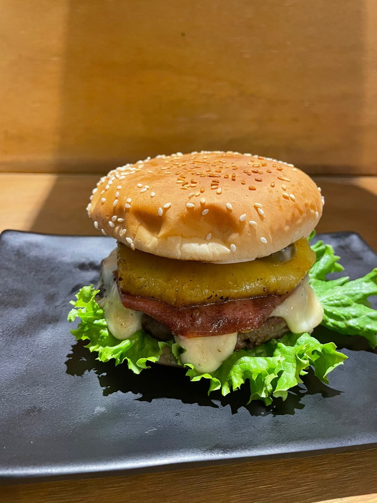 Carne de res sirloin, BBQ, piña, tocino,doble queso manchego y cebolla asada.
