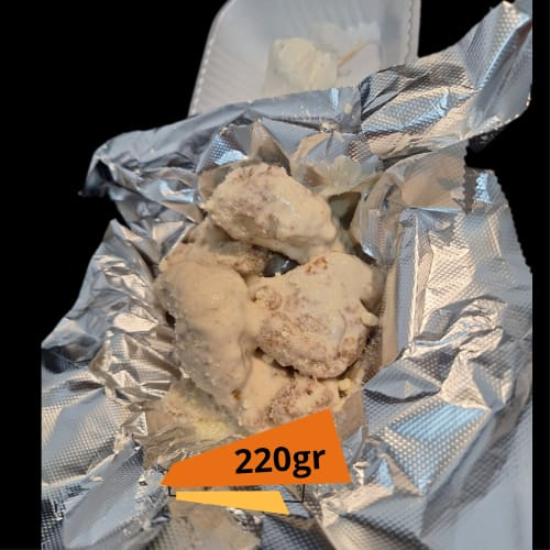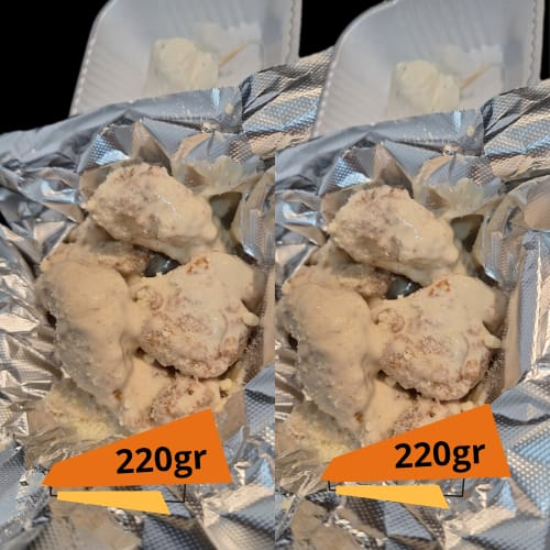 Incluye 2 aderezos ranch, bañados en su salsa y envuelto en papel aluminio para mantenerlas calientes.