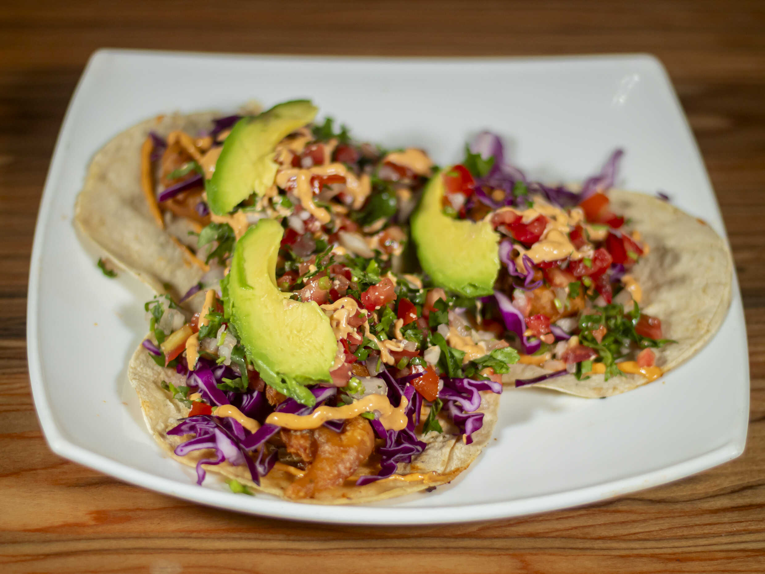 3 Tacos de pescado con col morada, cebolla morada con habanero y pico de gallo.