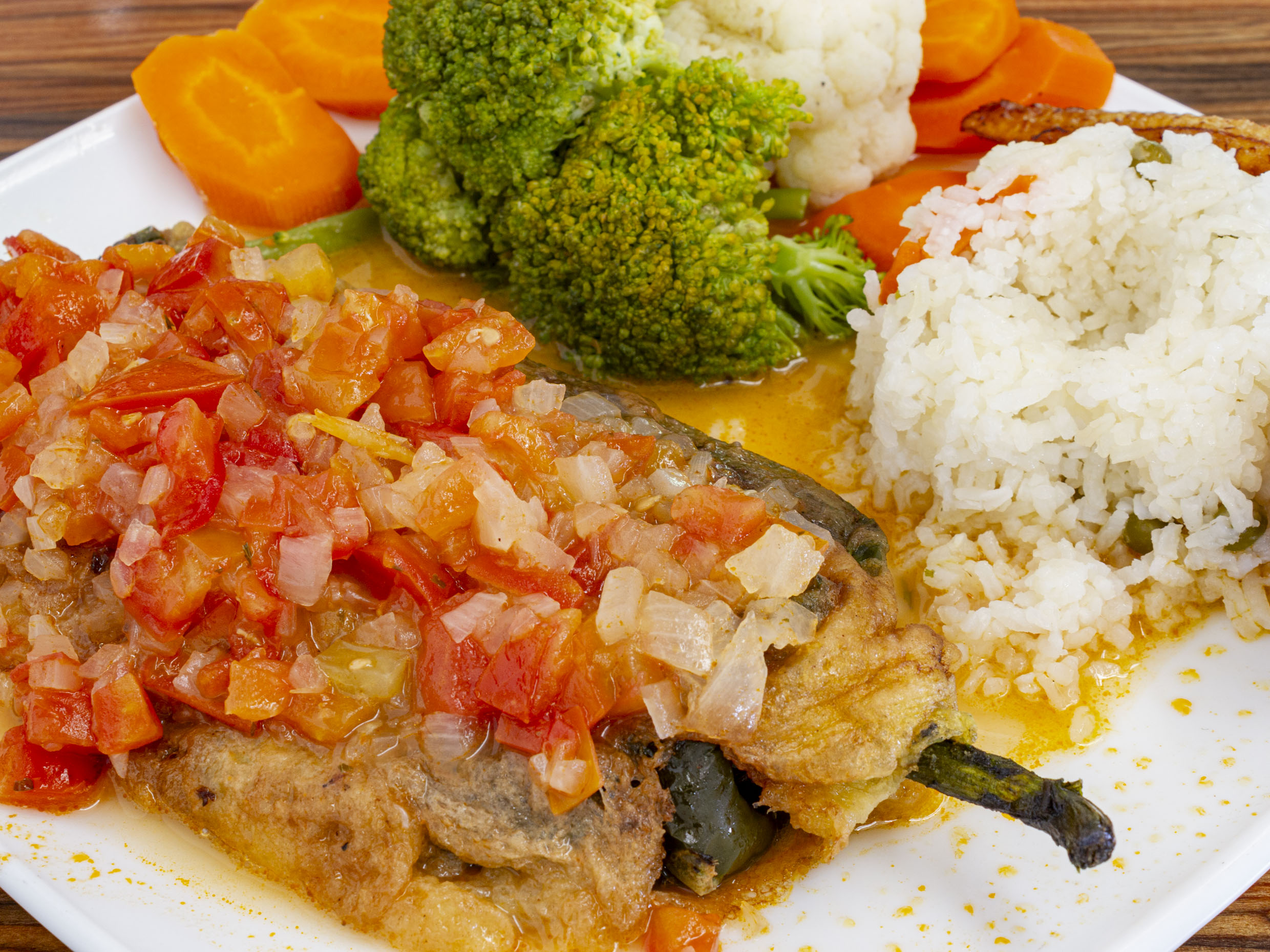 chile relleno de camarón y pulpo acompañado de verduras al vapor y arroz con platano