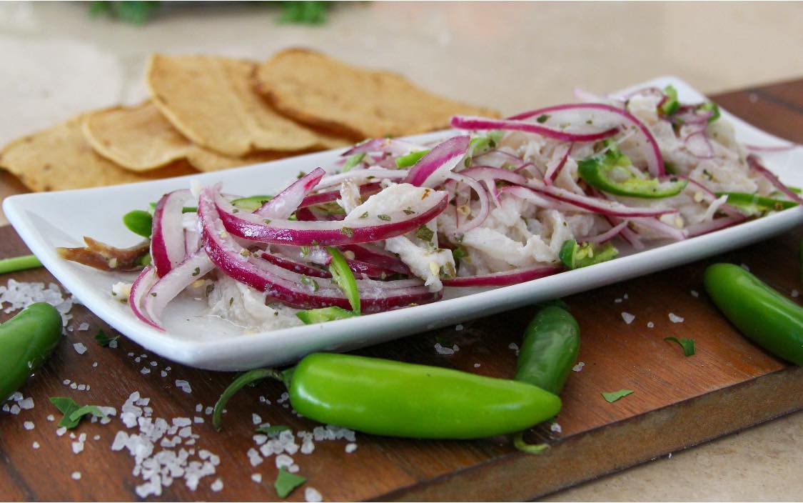 Tiritas de pescado cocidas en limón, cebolla morada y chile serrano.