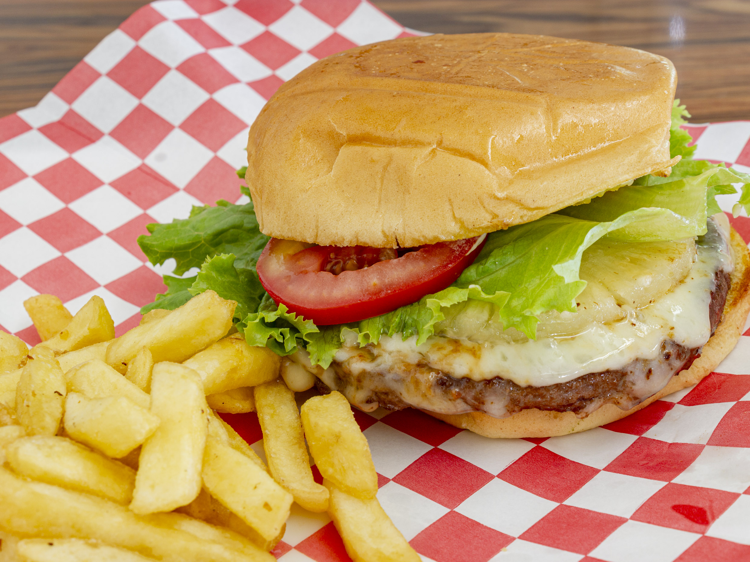 hamburguesa de arrachera con queso gouda, piña, jitomate, cebolla acompañada de papas a la francesa