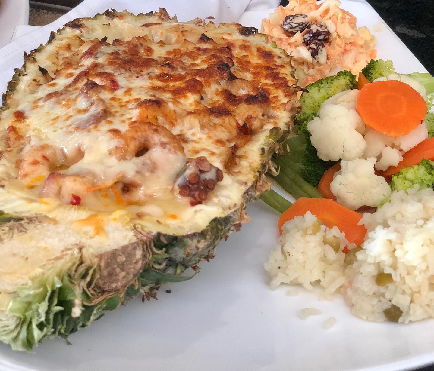 Alambre de camarón, pulpo y piña, acompañado de arroz con plátano, ensalada dulce y ensalada verde.