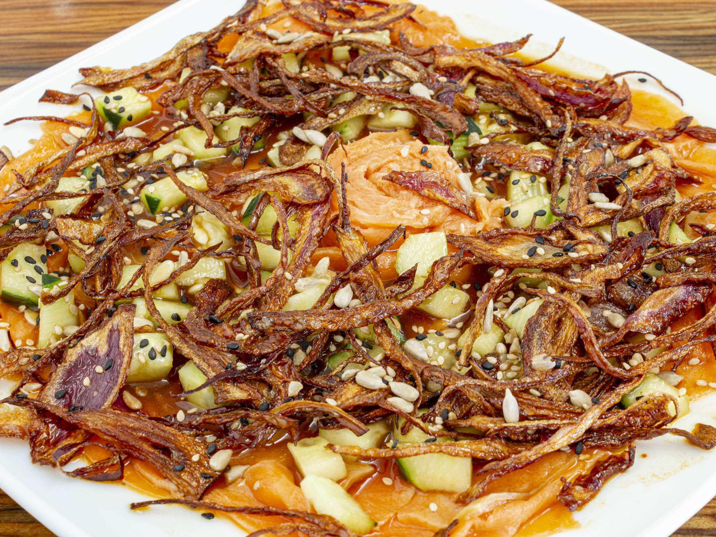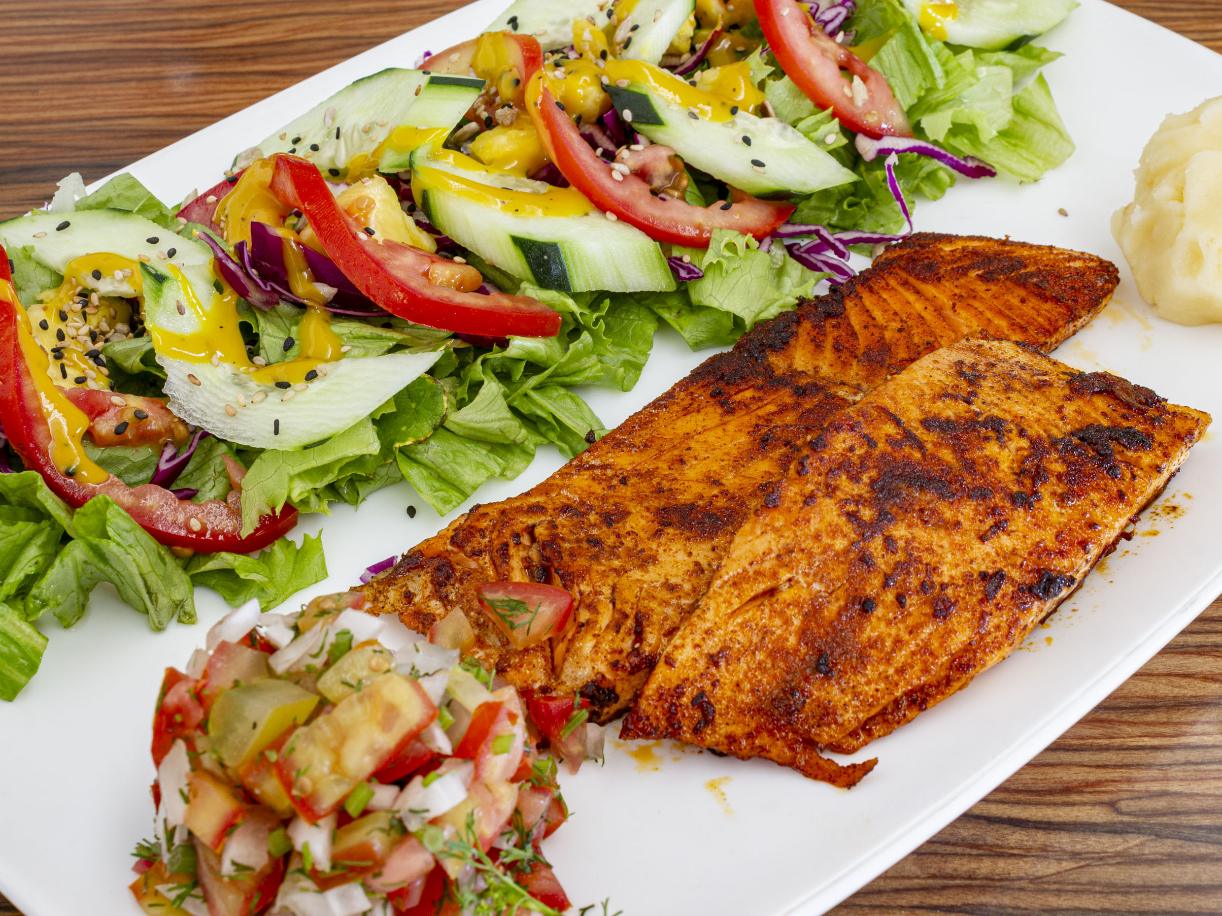 loncha de salmón con puré de papa y pico de gallo