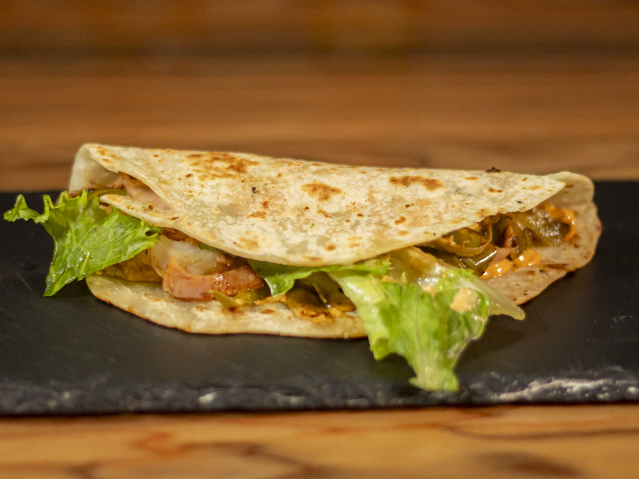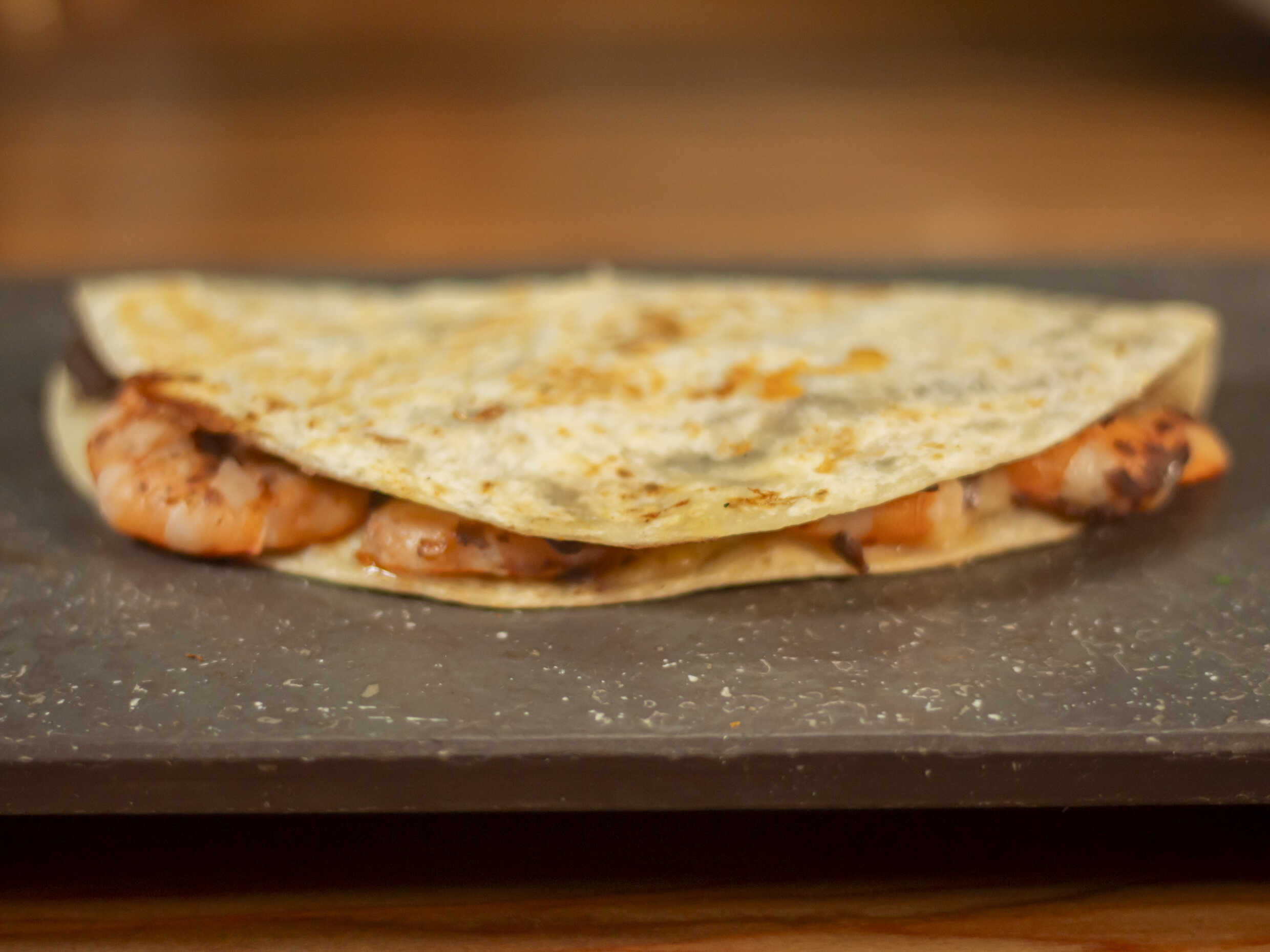 taco de tortilla de harina, frijoles, camarón y queso