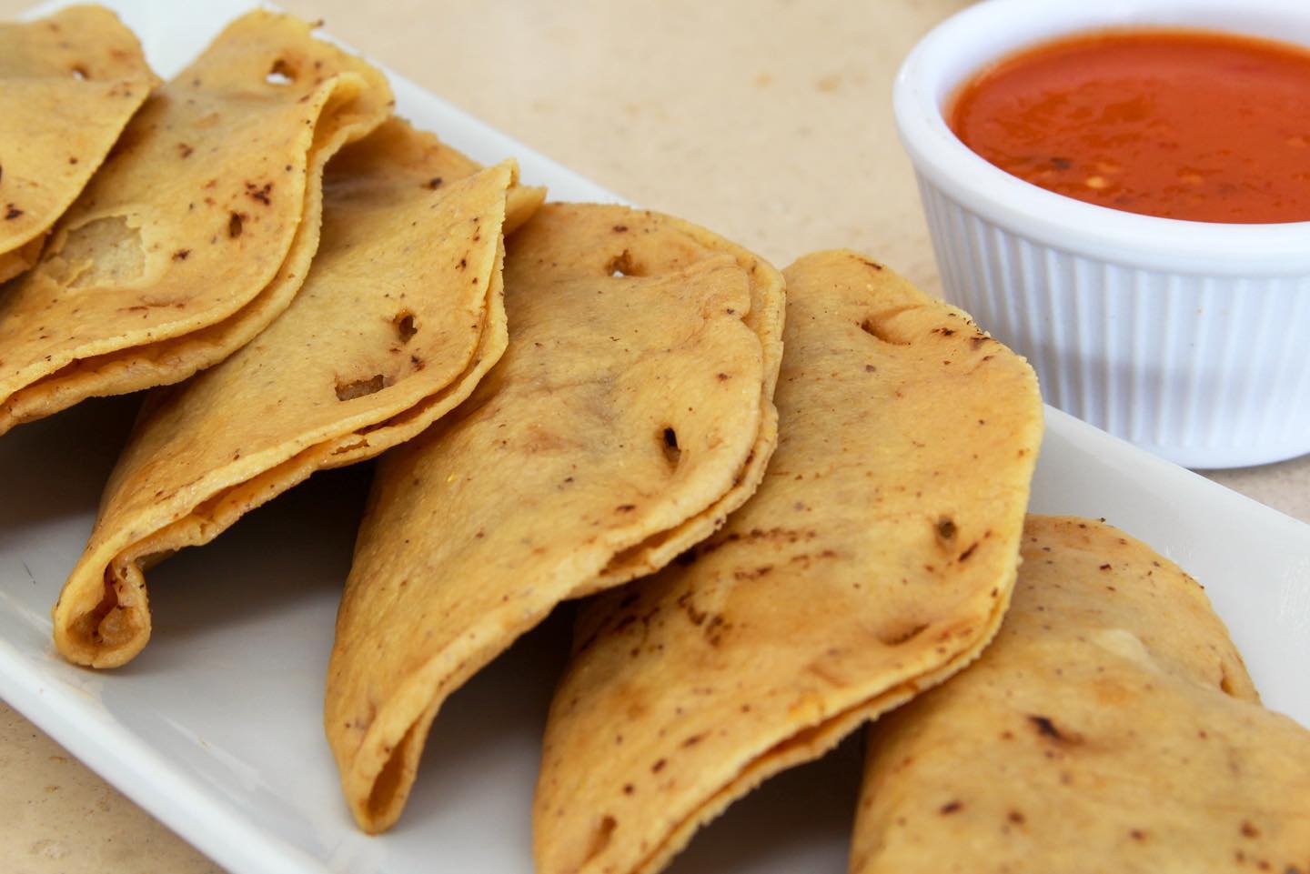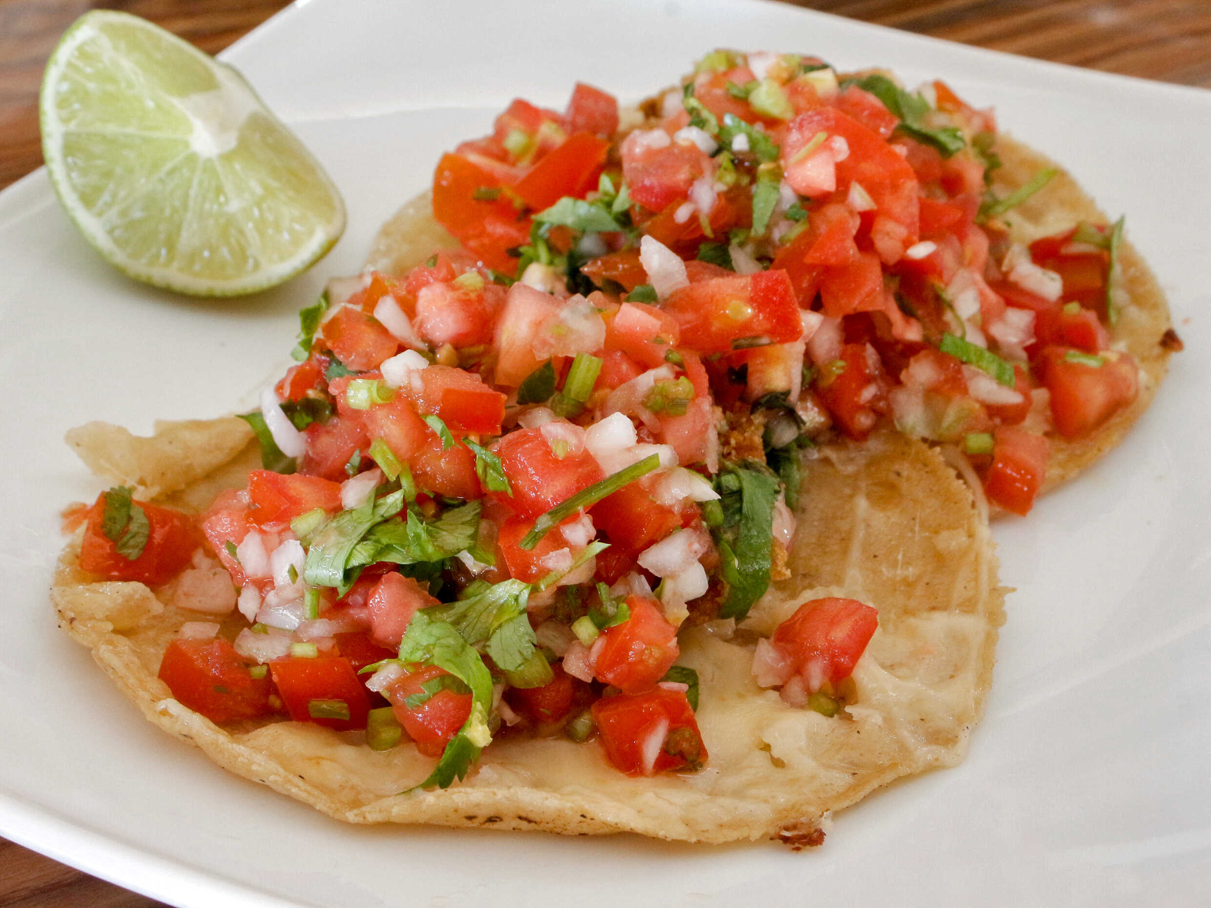 2 Tortillas de maiz, queso gratinado, camarones empanizados de chicharrón y pico de gallo encima.