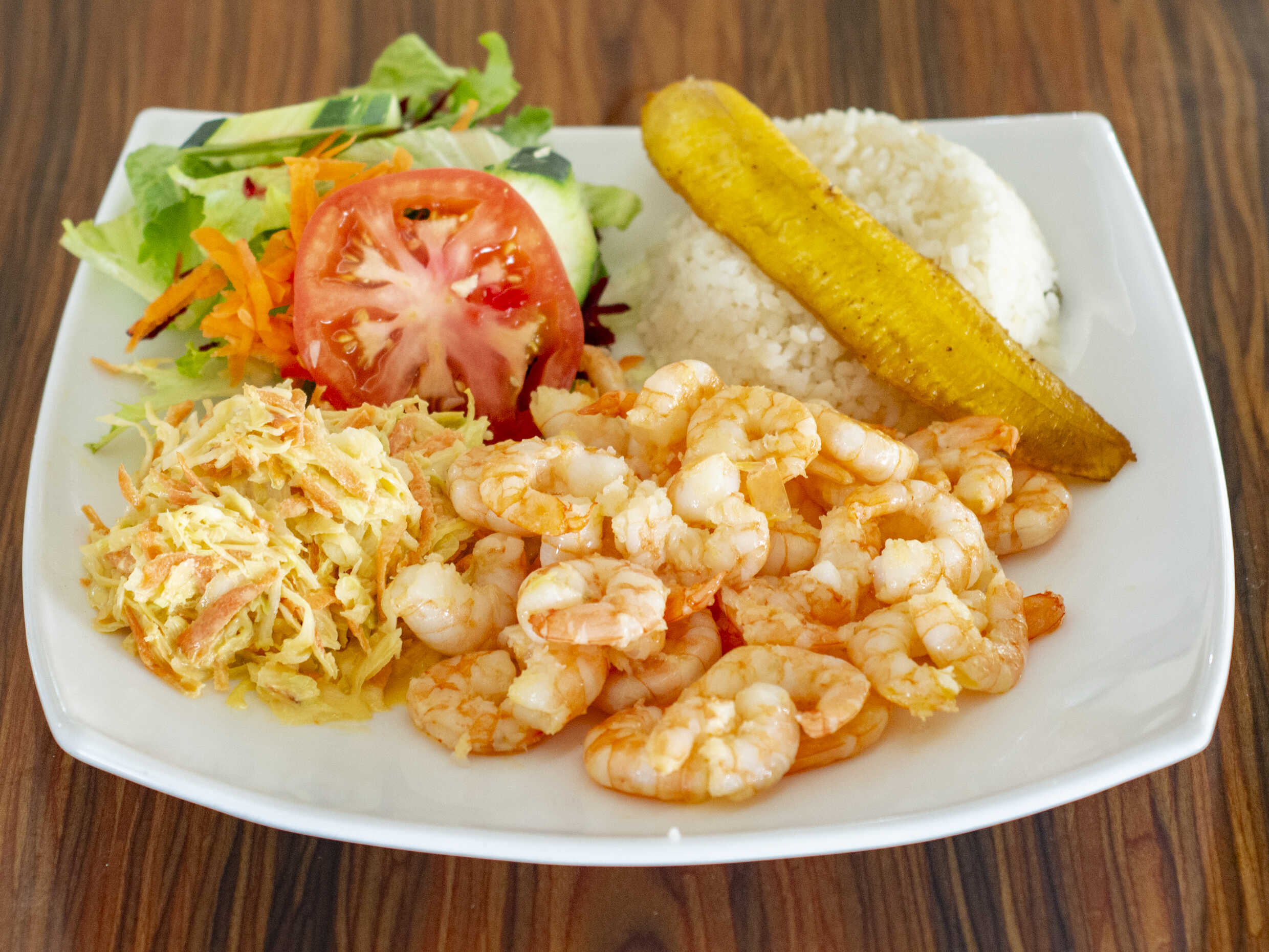 camarones a la mantequilla acompañado de arroz con platano, ensalada dulce y ensalada verde
