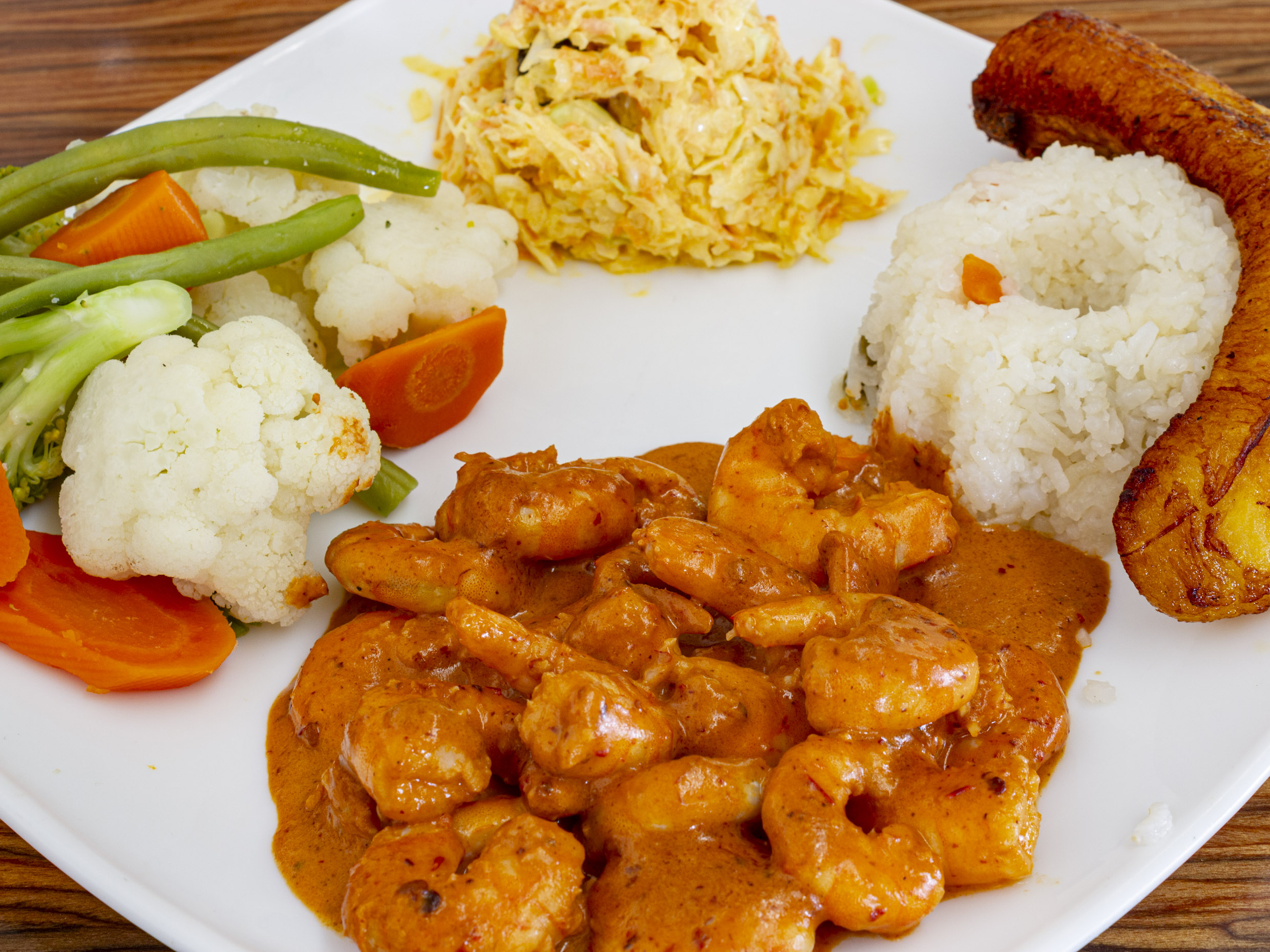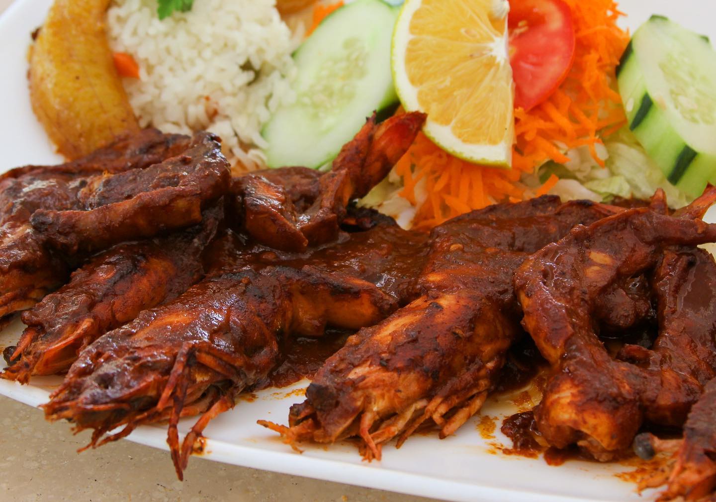 camarones a la diabla acompañado de arroz con platano, ensalada dulce y ensalada verde