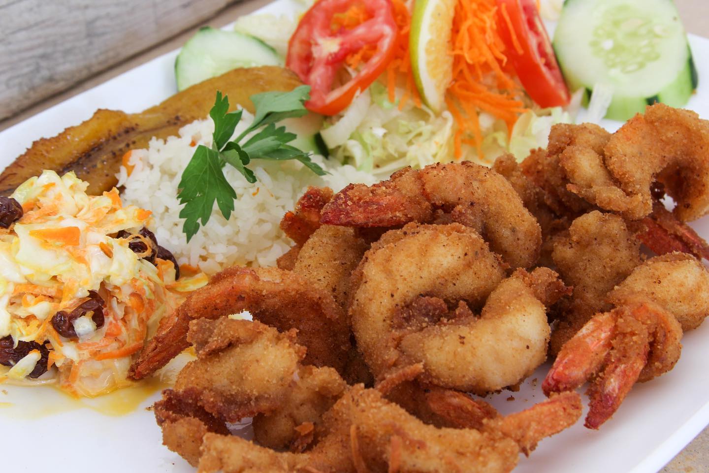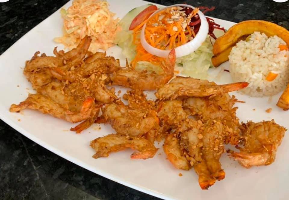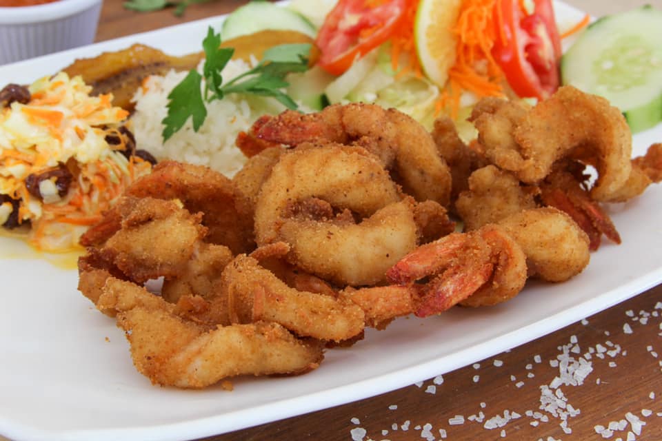 CAMARONES EMPANIZADOS, ACOMPAÑADOS DE ARROZ CON PLATANO, ENSALADA DULCE Y ENSALADA VERDE