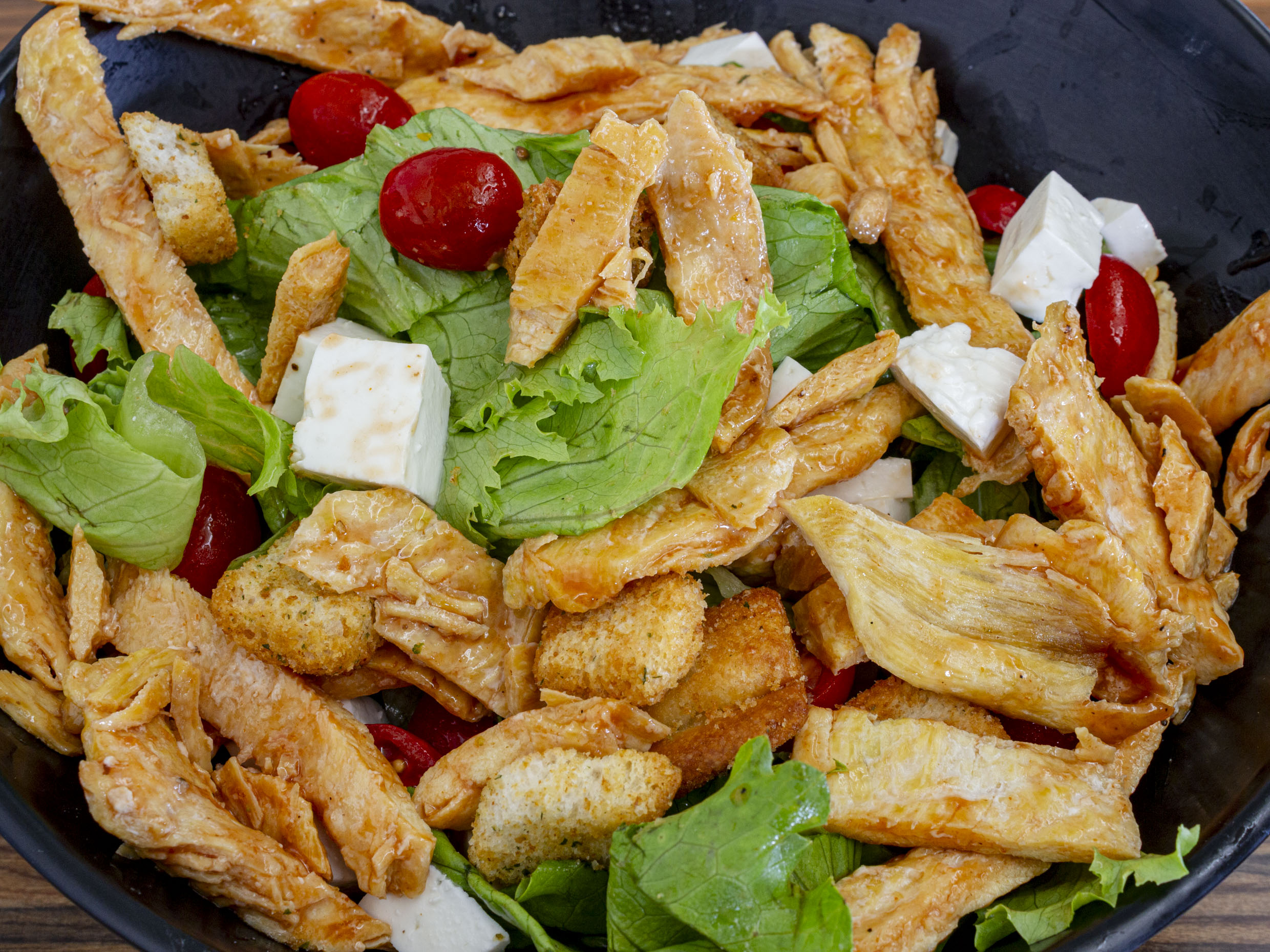 Ensalada de lechuga, jitomate, queso panela, pollo a la plancha, aderezo y crotones