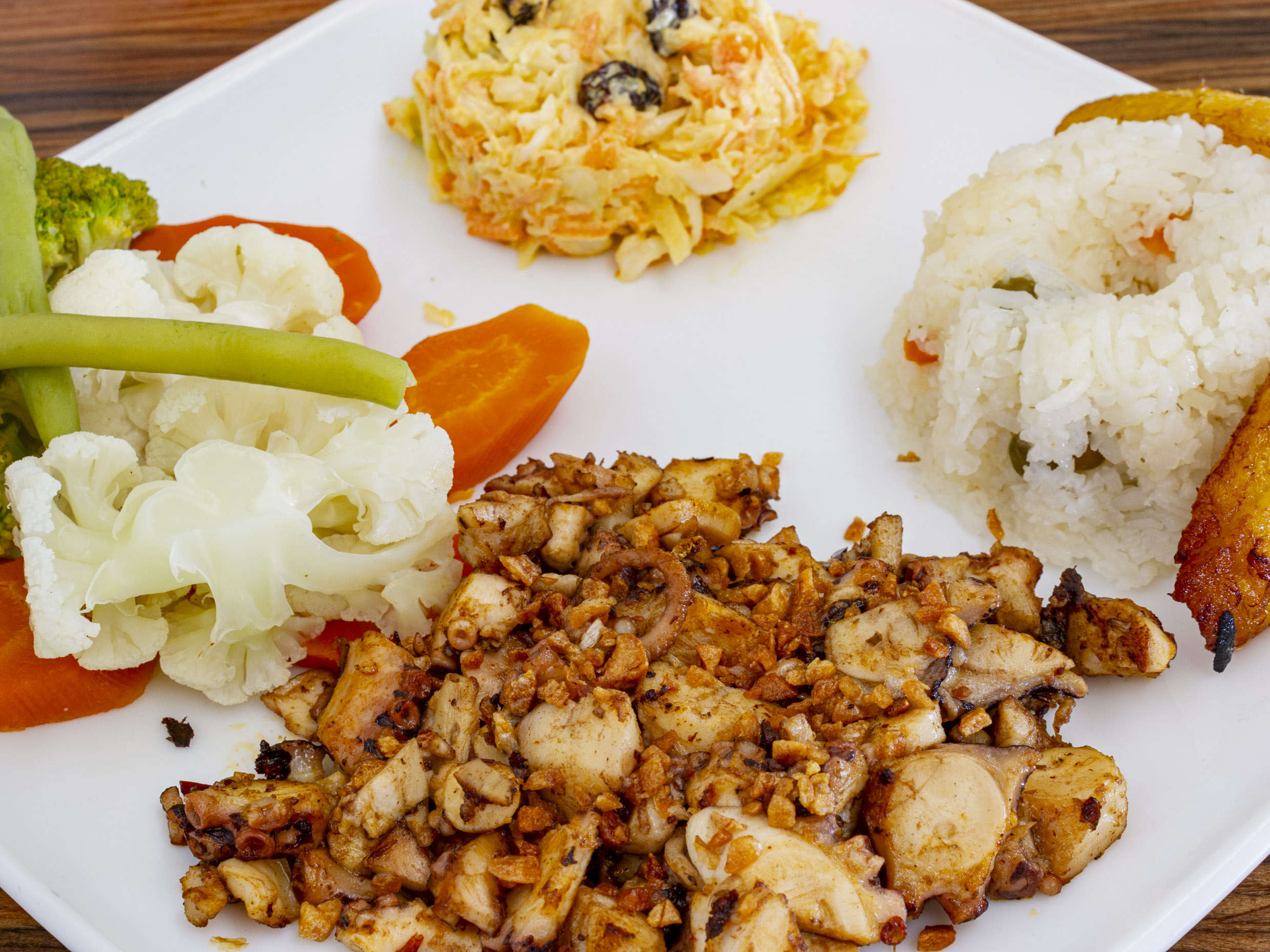 pulpo al mojo de ajo acompañado de arroz con platano, ensalada dulce y ensalada verde