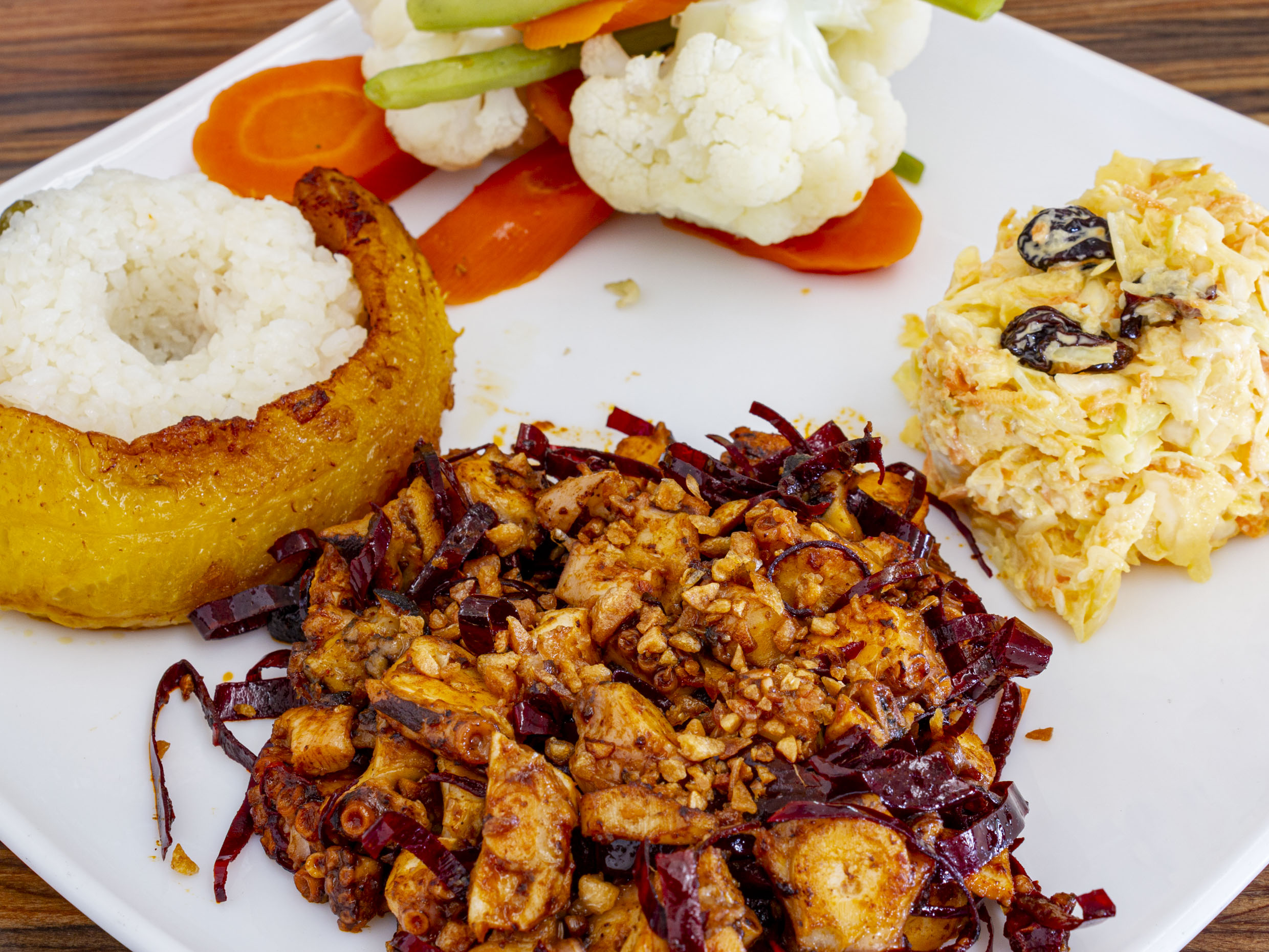 pulpo al ajillo acompañado de arroz con platano, ensalada dulce y ensalada verde