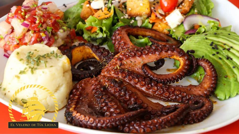 pulpo a la parrilla 250 gr acompañado de puré de papa y pico de gallo