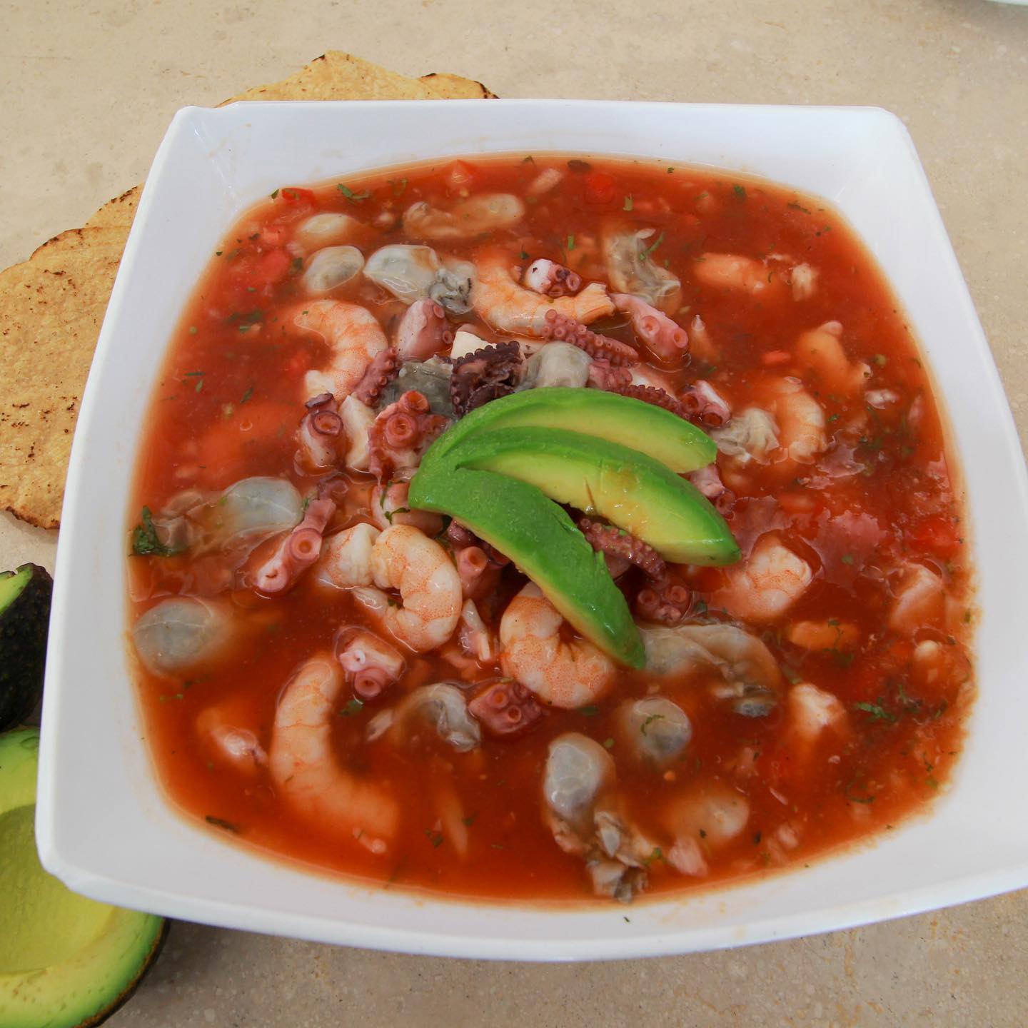 1/2 Litro. Ceviche, ostión, pulpo, camarón y pata de mula.
