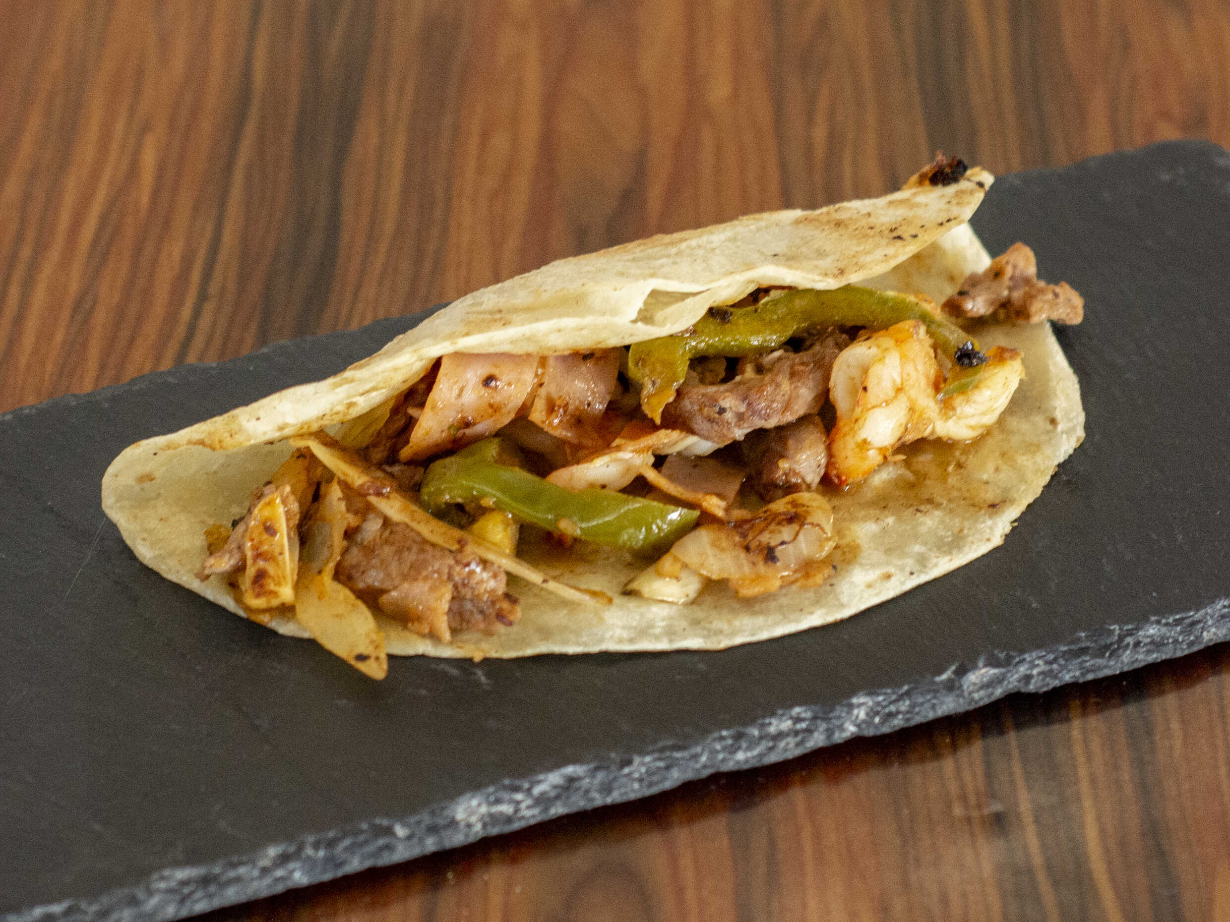 Taco de alambre de camarones y arrachera en tortilla de harina.