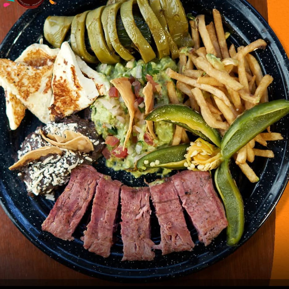 Acompañados de guacamole, frijoles refritos, papas a la francesa nopal, chile asado, trozo de queso asado con totopos.